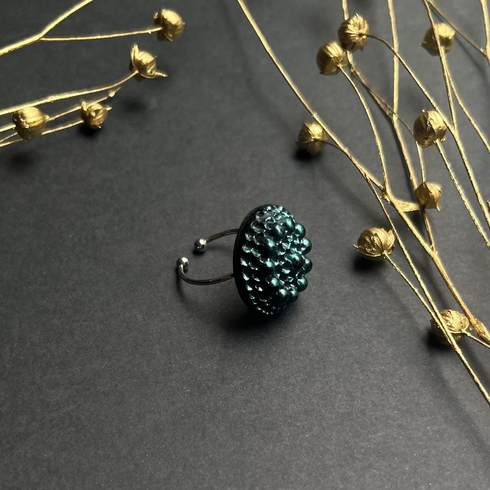 En pièce unique la bague "CASELOTTI" est composée avec un bouton ancien en verre irisé vert.
