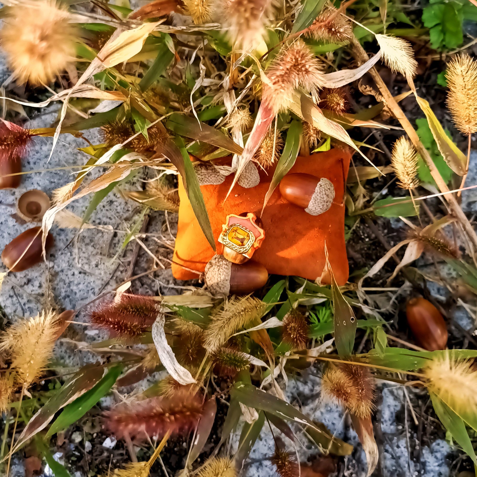 Elle comprend une fève vintage -motif couronne coloris potiron- ornée d'un cabochon strass coloris topaze.