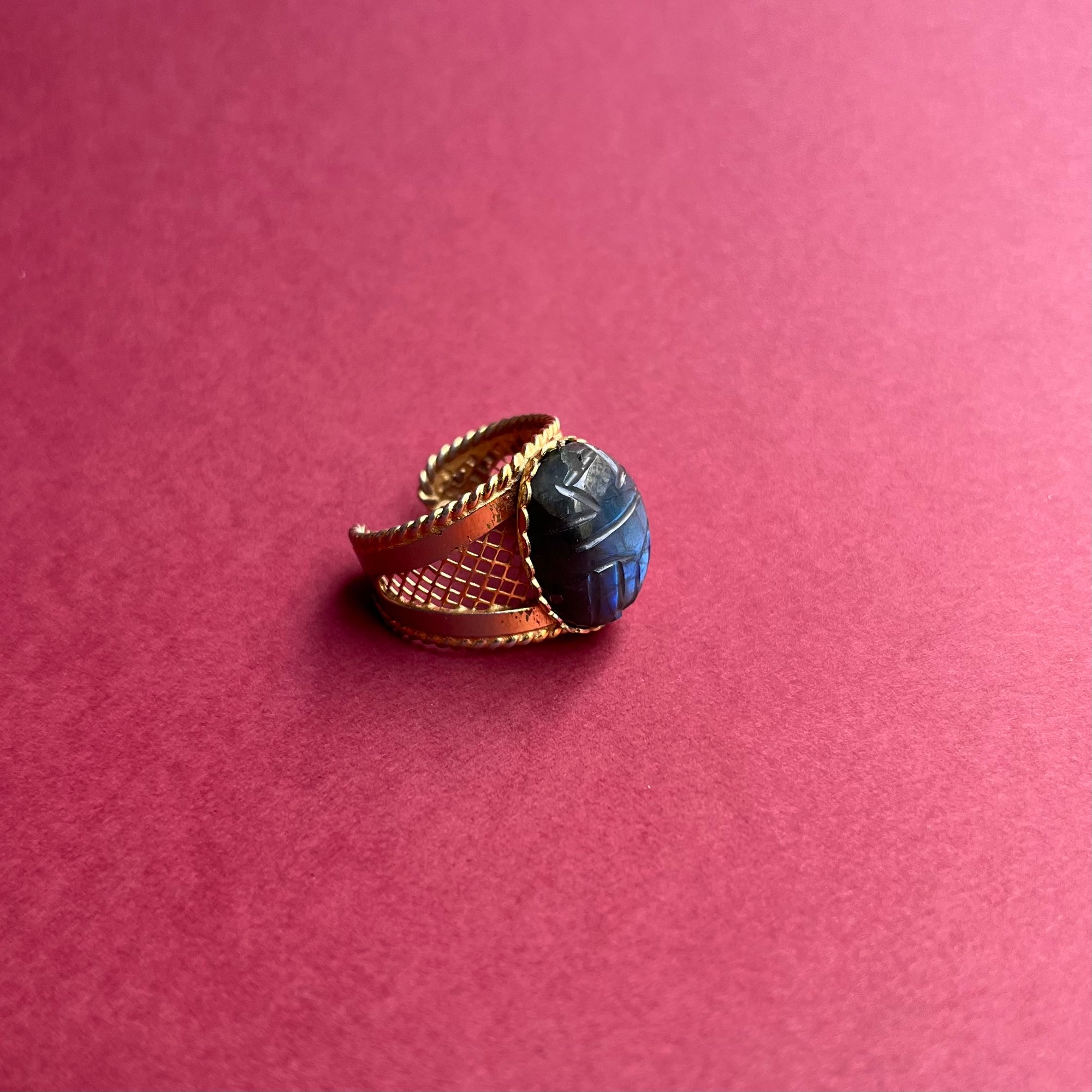 La chevalière vintage "YAKINTHI" est une pièce unique rénovée avec un cabochon motif scarabée en pierre dure.Collection "MARIA CALLAS"