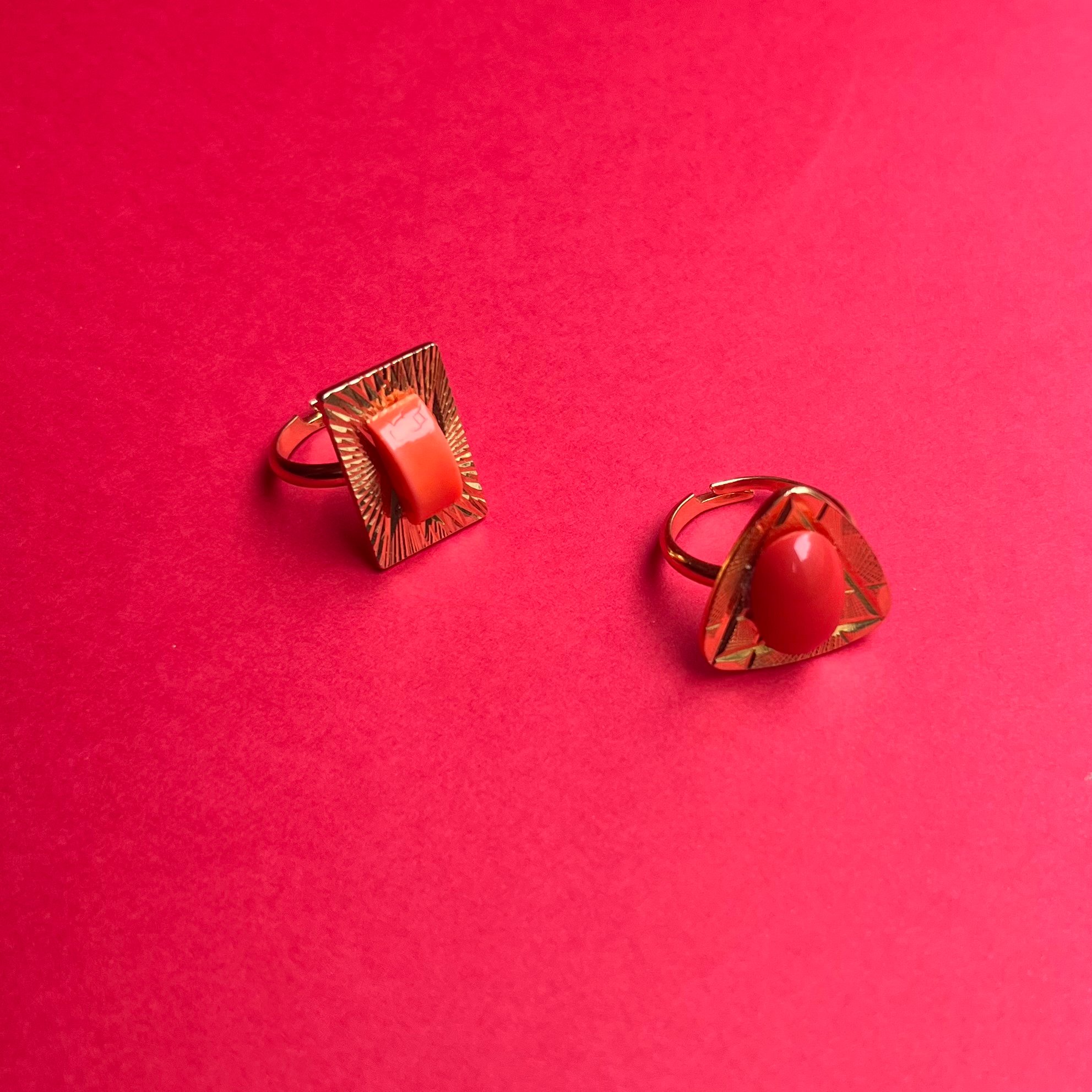 Les bagues "PURDEY" sont deux pièces uniques réalisées avec des cabochons en verre vintage opaques rouge et orange.