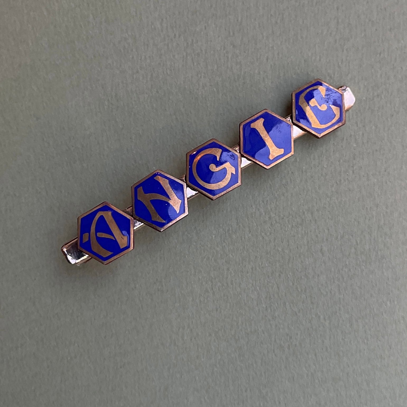 La barrette "ANGIE" est une barette personnalisée dont les lettres (5 initiales) peuvent être changées sur demande en MP.Certaines lettres vintage sont en e-mail bleu, d'autres en émail noir.Collection "PERSONNALISABLE"