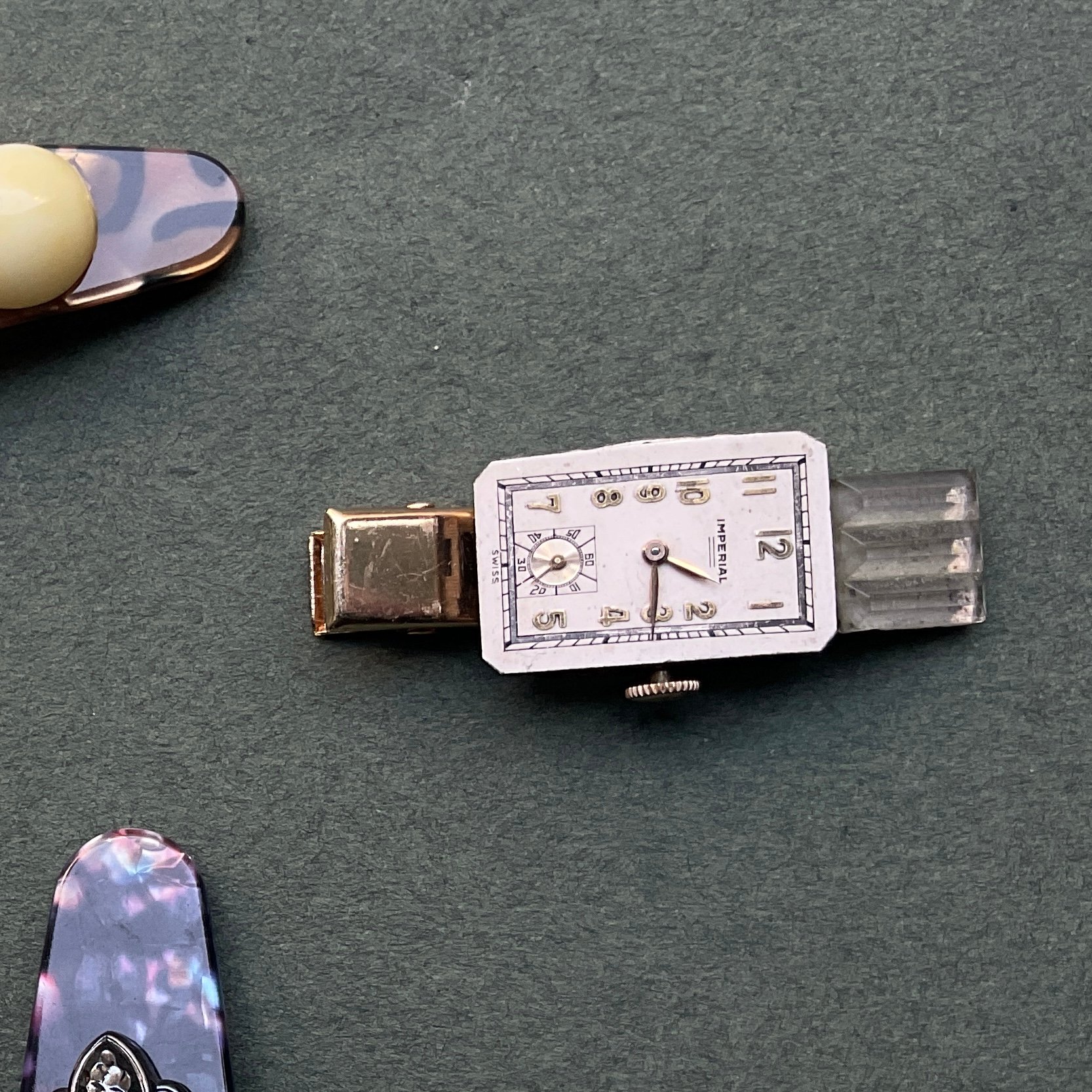 La barrette "OSSAWA" est une pièce unique composée de matériaux upcyclés. Elle comprends dans sa composition un carré en verre ancien.Mesure : Longueur 6 cm Collection " JOSÉPHINE BAKER"