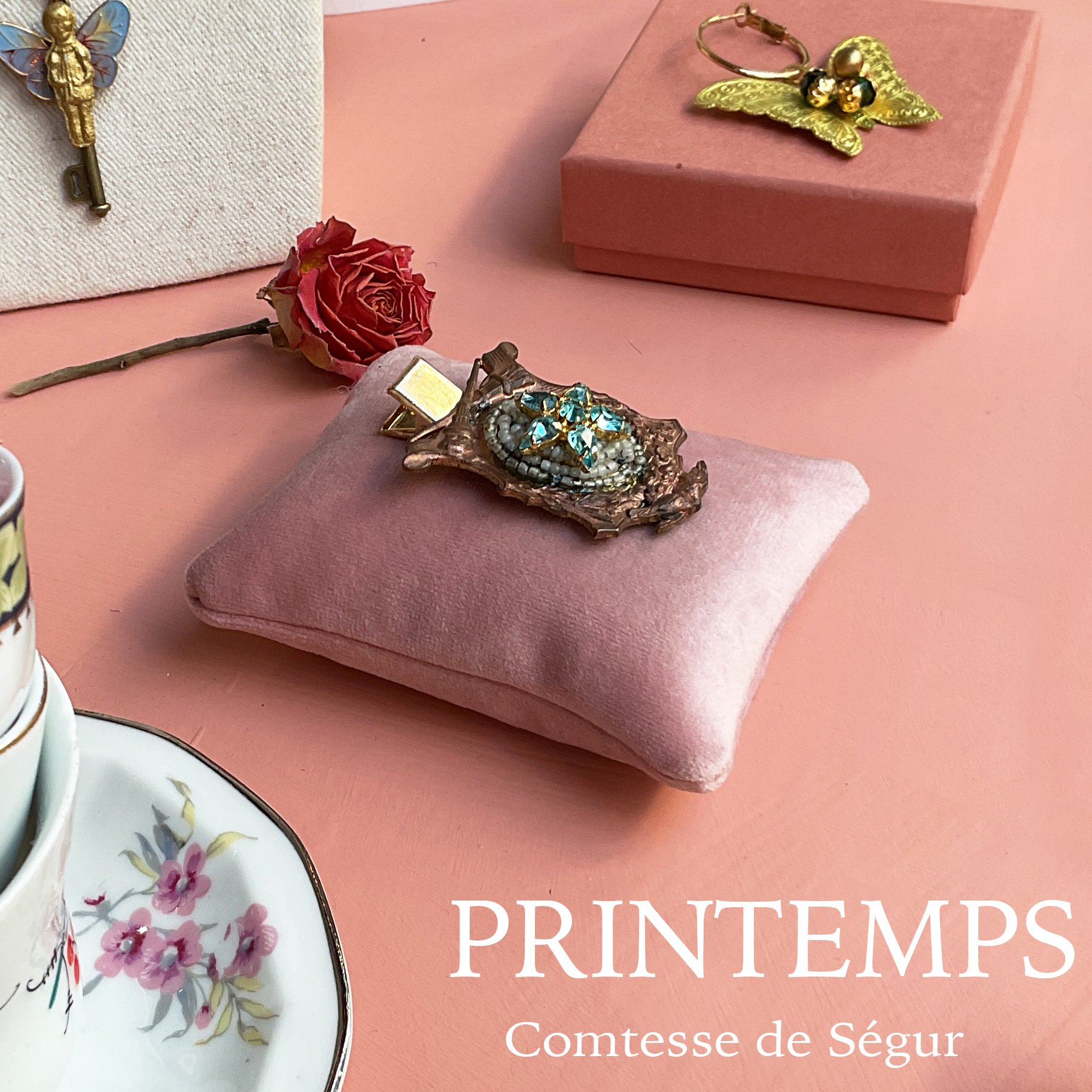 La barrette "SAVARIN" est une pièce unique composée avec des matériaux upcyclés.Collection Printanière "COMTESSE DE SÉGUR"