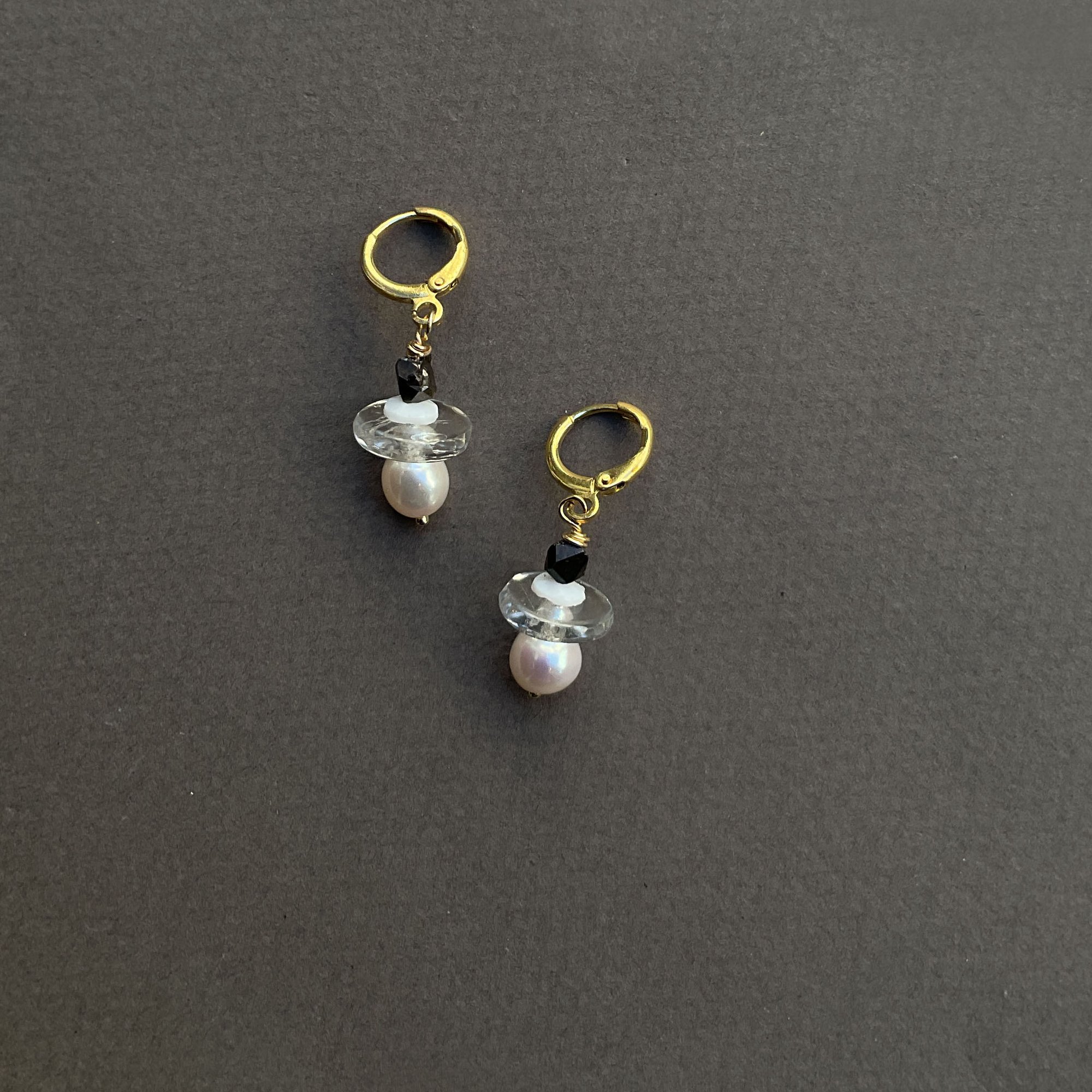 Verre vintage transaparent et gouttes nacrées perles de culture, éclat de cristal de roche métallisé noir.
