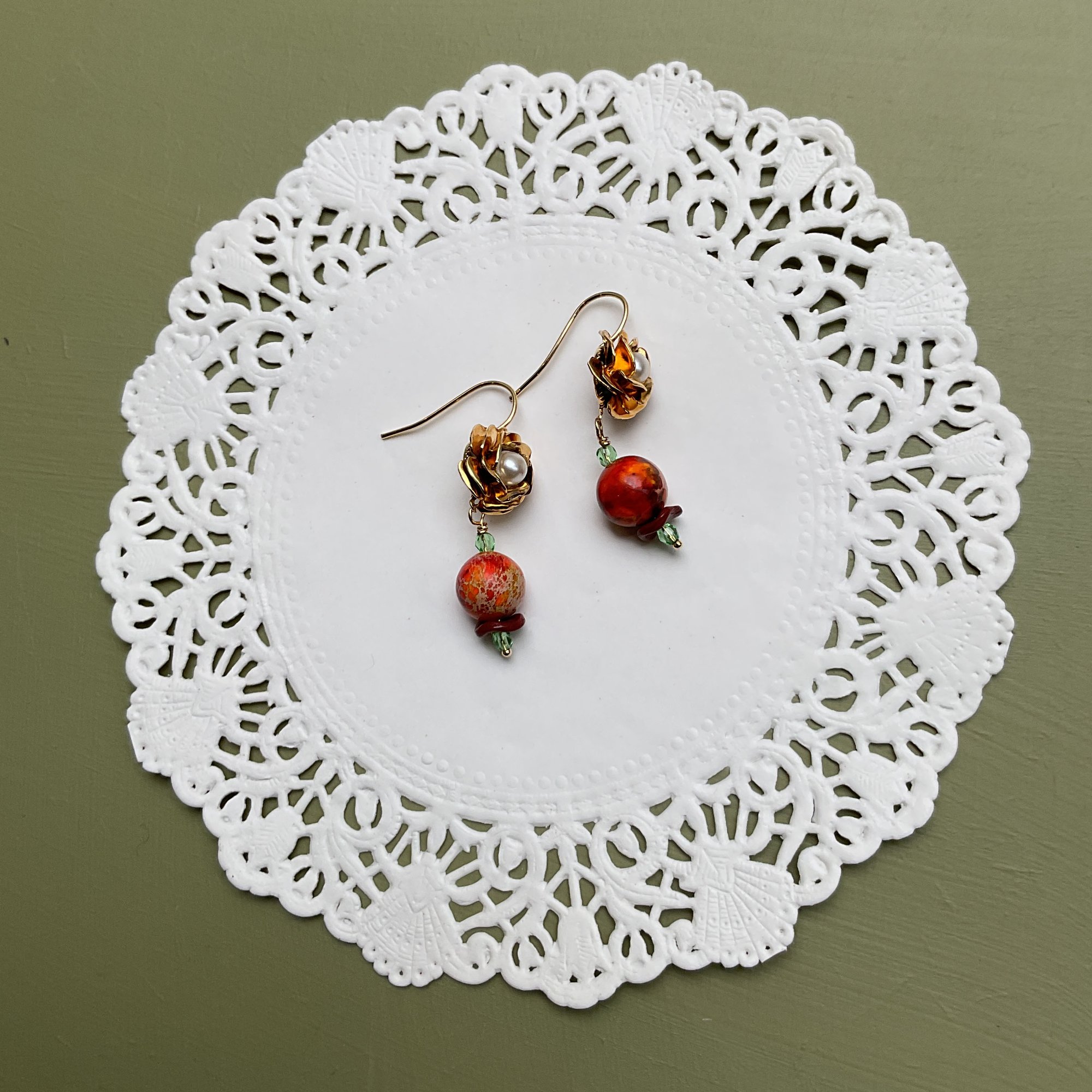 Il comprends dans sa composition des petites roses en métal doré (pin's détournés) et des perles en pierre dure coloris brique.