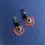 Elles comprennent dans leur composition des boutons anciens en jais noir, des cœurs recyclés en laiton émaillé noir et des estampes récentes émaillées coloris corail transparent.
