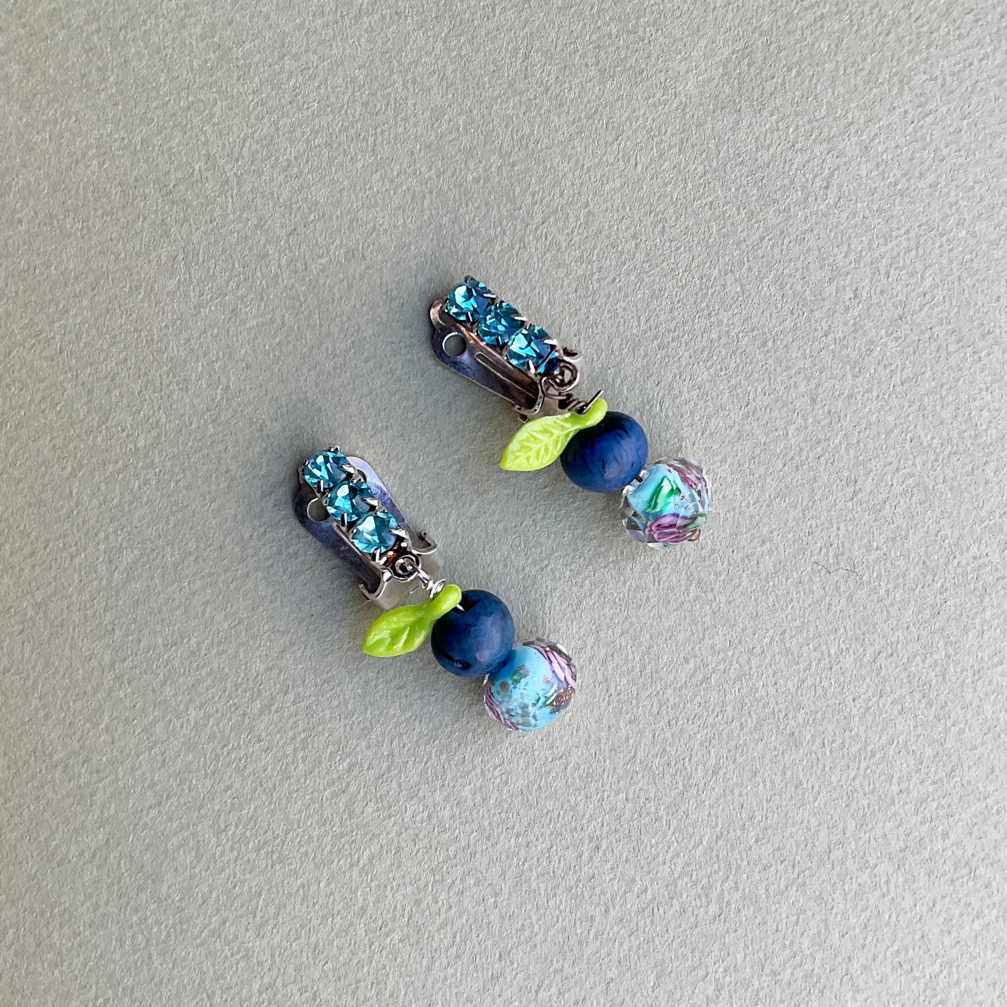 Clips strass vintage coloris aquamarine, petites perles en graine teintée bleu, petite feuilles en résine verte pomme.