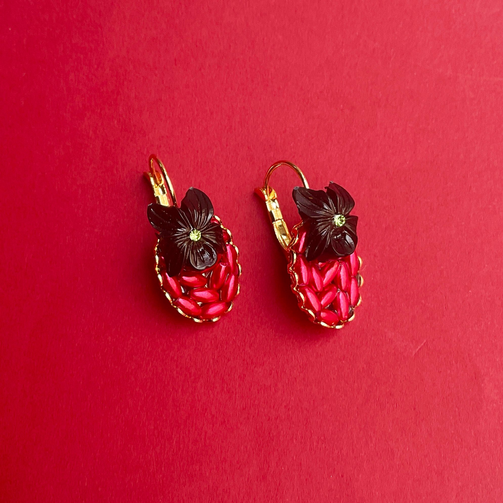 Il comprend dans sa composition des perles upcyclées et des petites fleurs noires vintage.