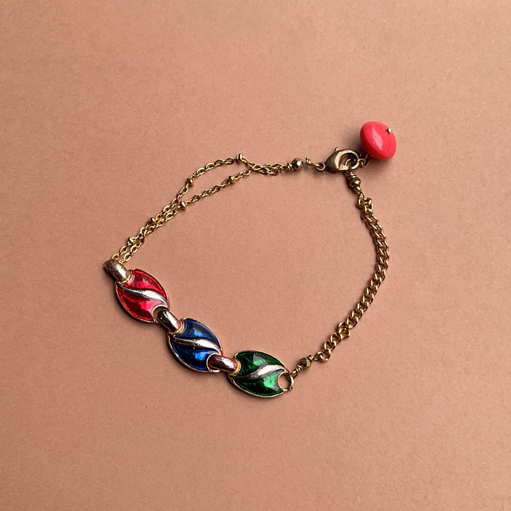 Le bracelet « GILLIAN » est une pièce unique composée avec des matériaux upcyclés.