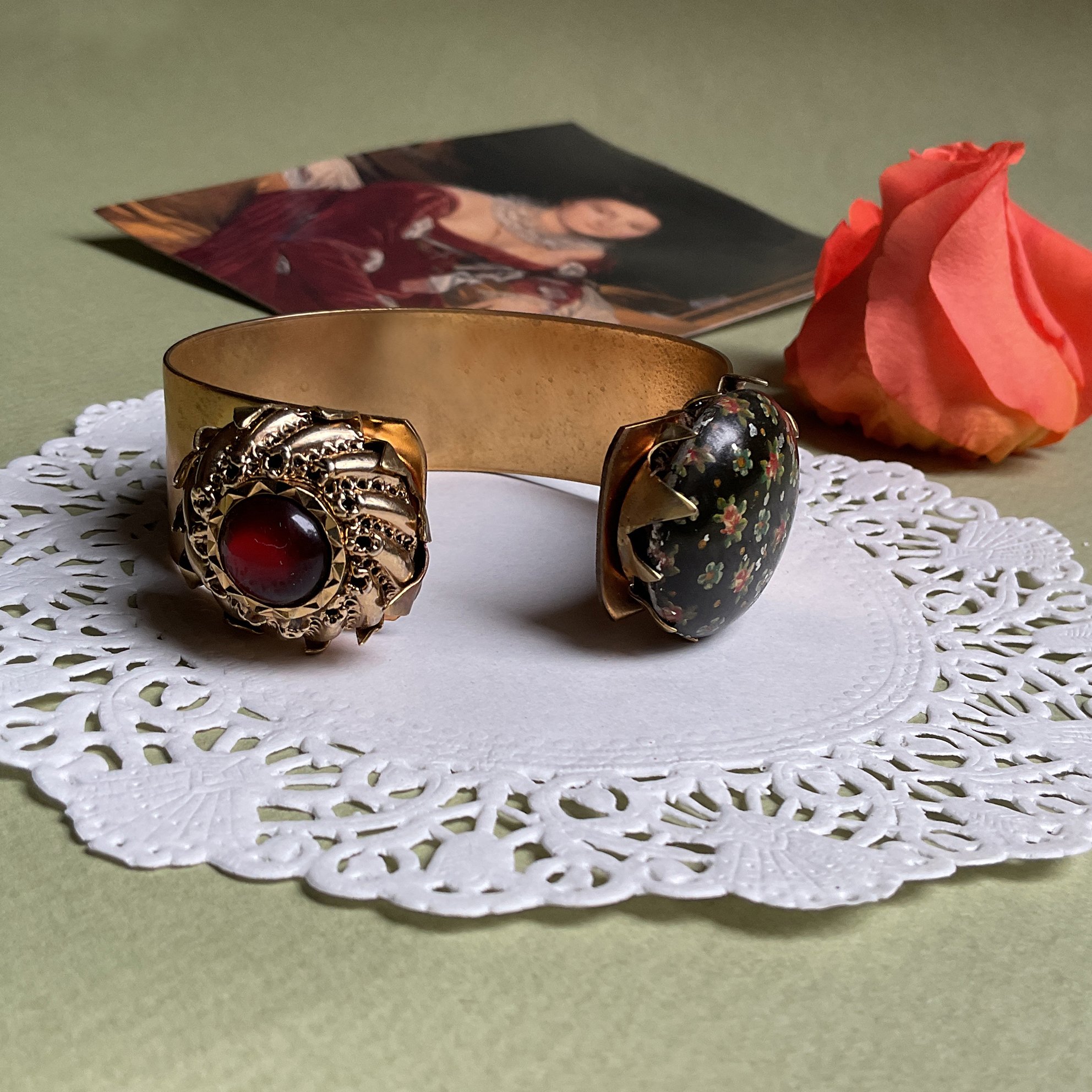 La manchette« LINDSEY » est une pièce unique composée avec des matériaux upcyclés, bouton vintage millefiori.