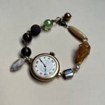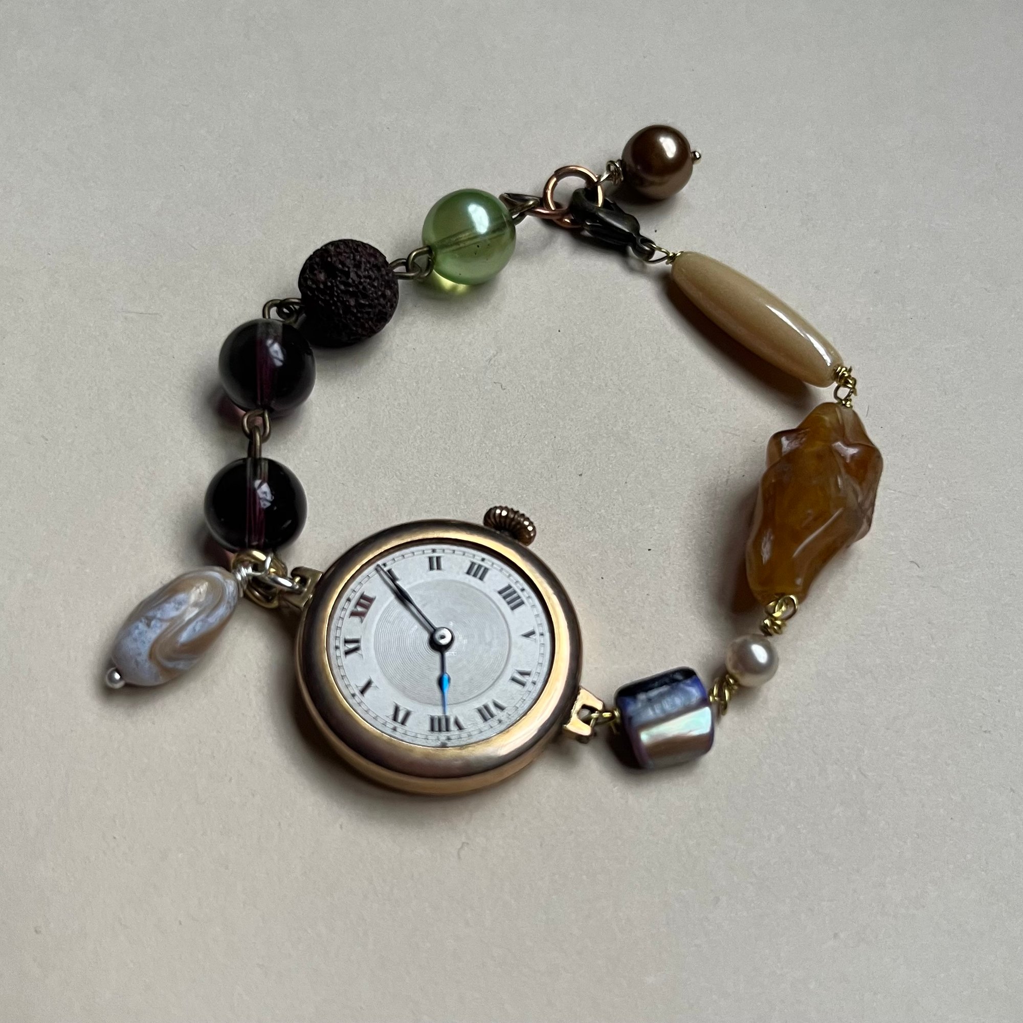 Elle comprend dans sa composition une montre ancienne customisee avec des perles en pierre de lave marron foncé.