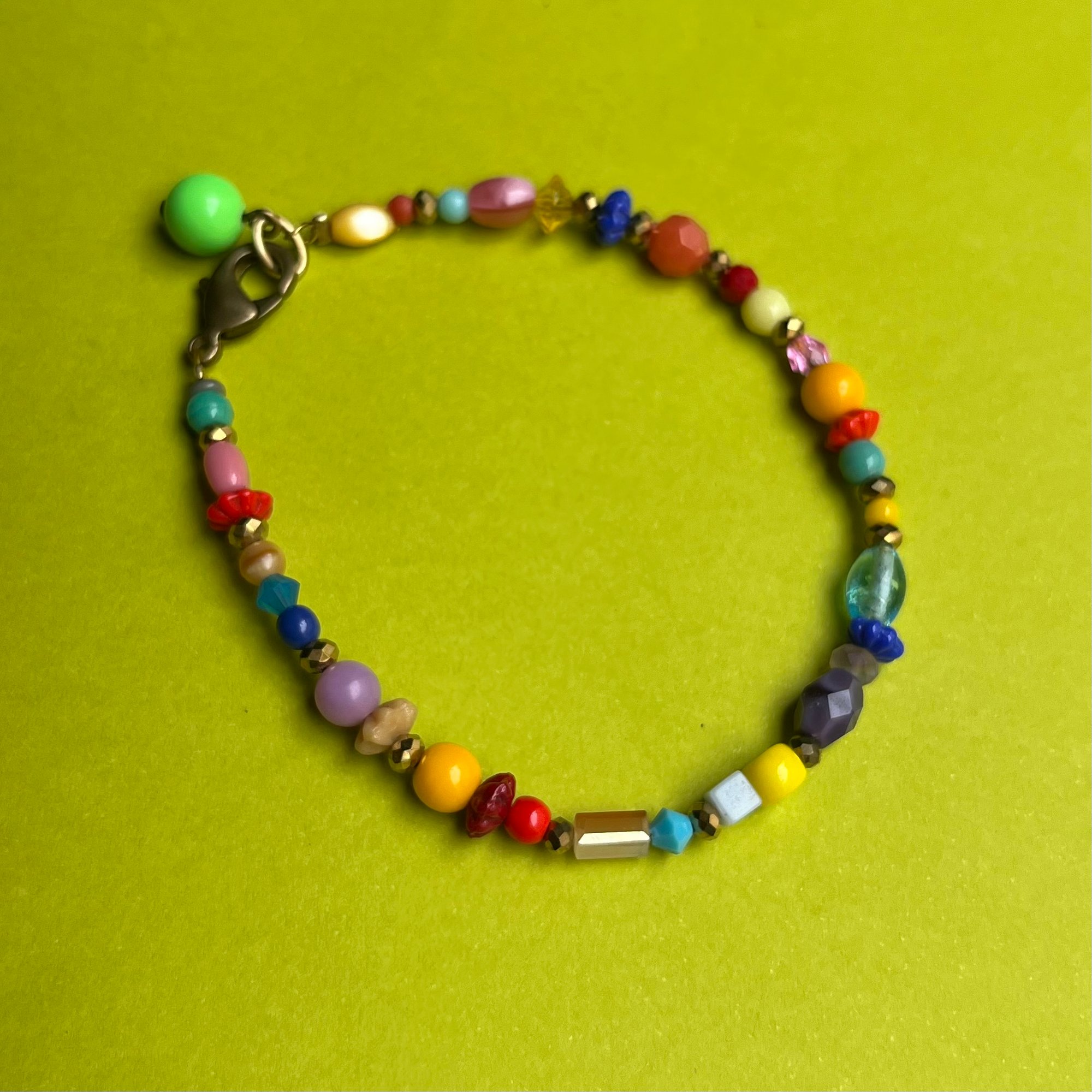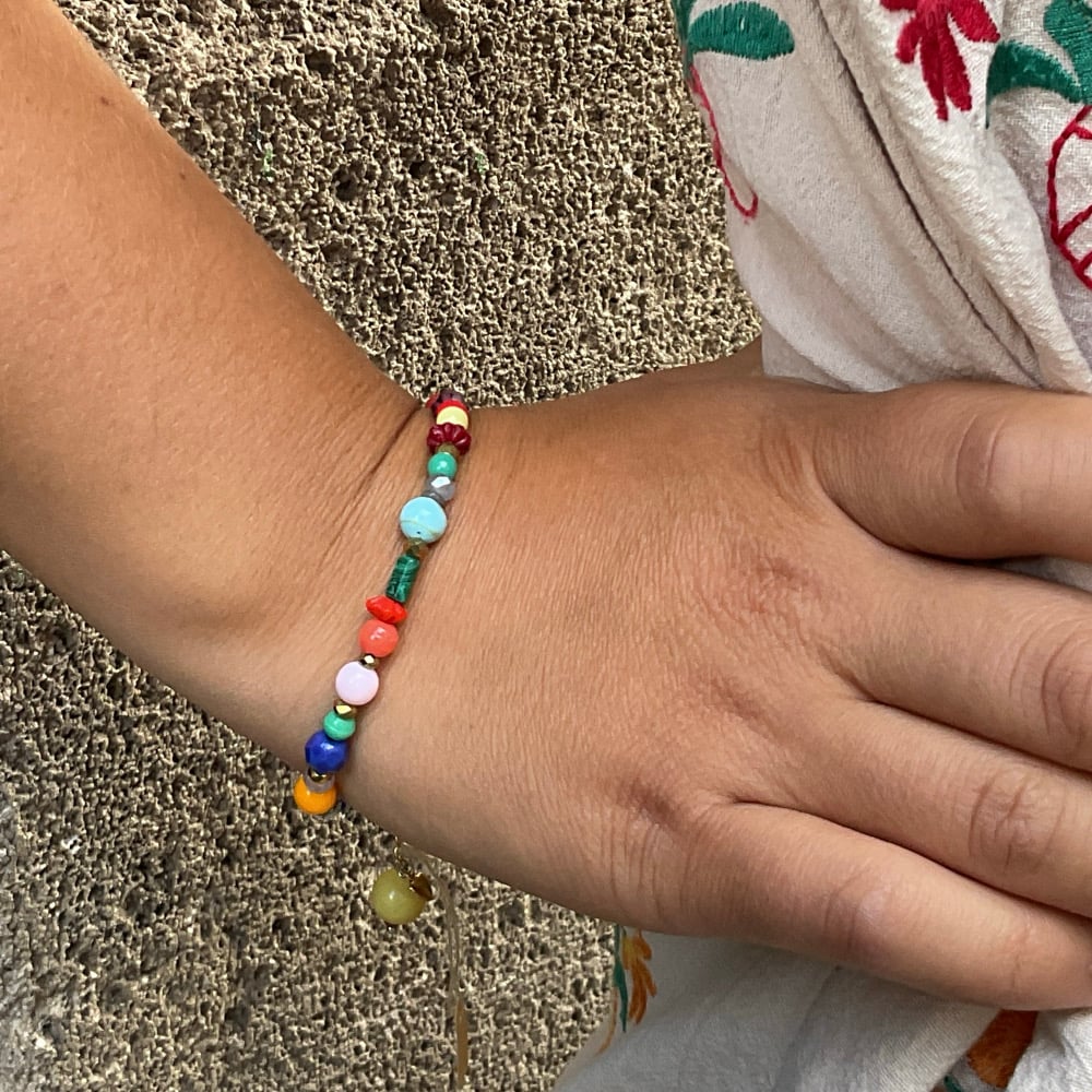 Le bracelet « POP N°1 » est un petit bracelet ludique que je me suis lancée à composer avec toutes les petites perles en verre vintage et récentes de l’atelier.