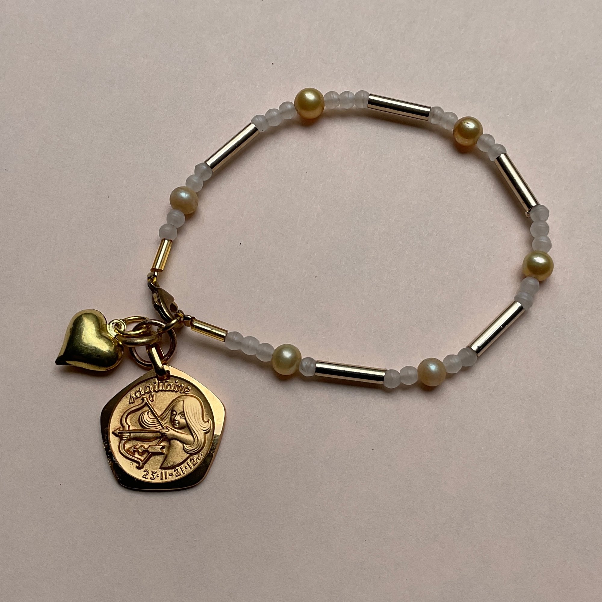 Le bracelet "Sagittaire" est une pièce unique composée à l'atelier parisien. Il comprend dans sa composition une médaille vintage plaquée or avec un motif rétro "petite fille tirant à l'arc" pour symboliser le signe de l'horoscope.Collection Zodiaque "ASTRAL"mesure 17 cm
