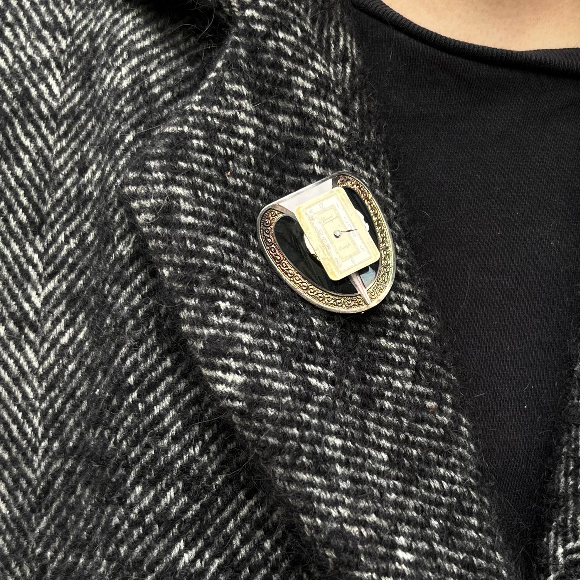 Il comprend dans sa composition une boucle Art Déco bicolore noir et blanc et un système de montre vintage upcyclé.
