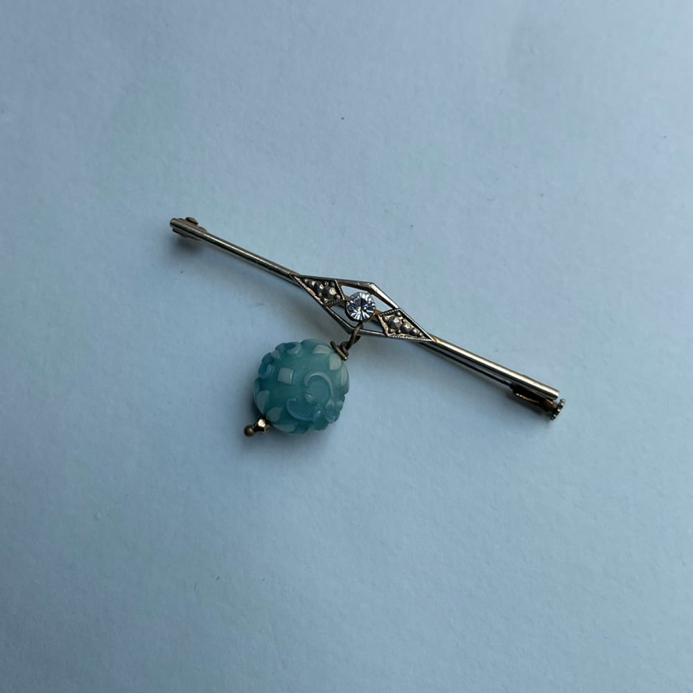 Ce modèle joue le contraste des matières entre une broche allongée ancienne et une petite perle récente recyclée en résine bleue pâle.