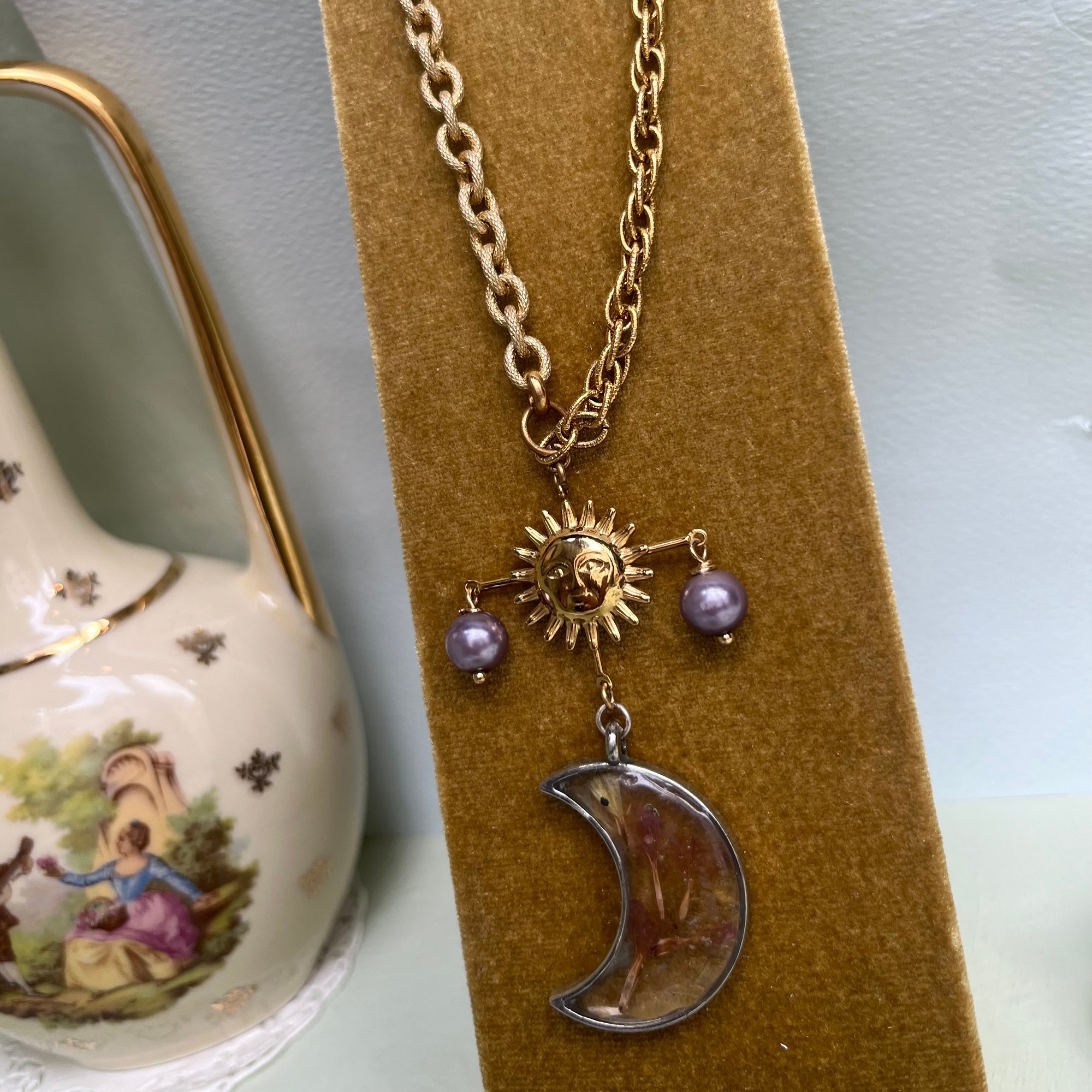Il comprend dans sa composition des chaînes upcyclées et une lune en résine vintage avec des petites pétales de fleurs en inclusion, un petit balancier avec soleil doré central et deux perles nacrées mauves recyclées.