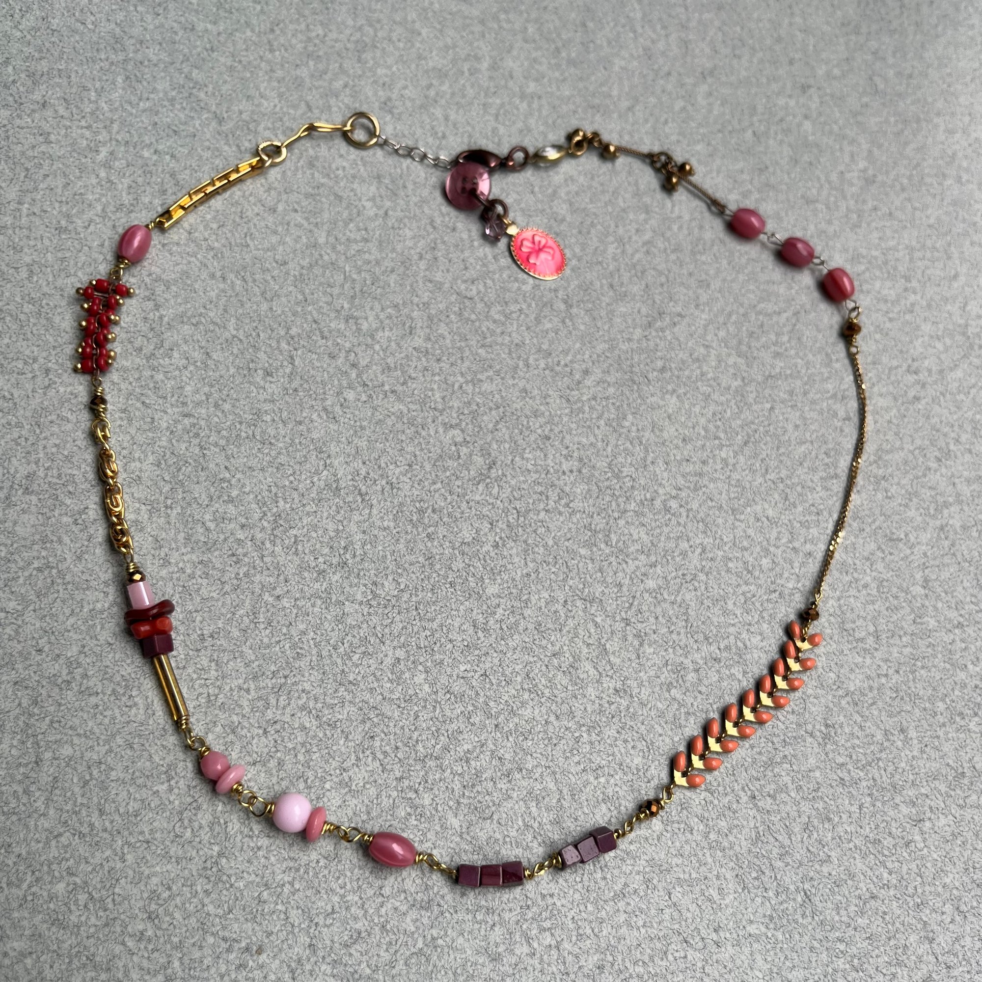 En pièce unique, le collier "GREUZE" est une composition upcyclée de multi-perles roses vintage.