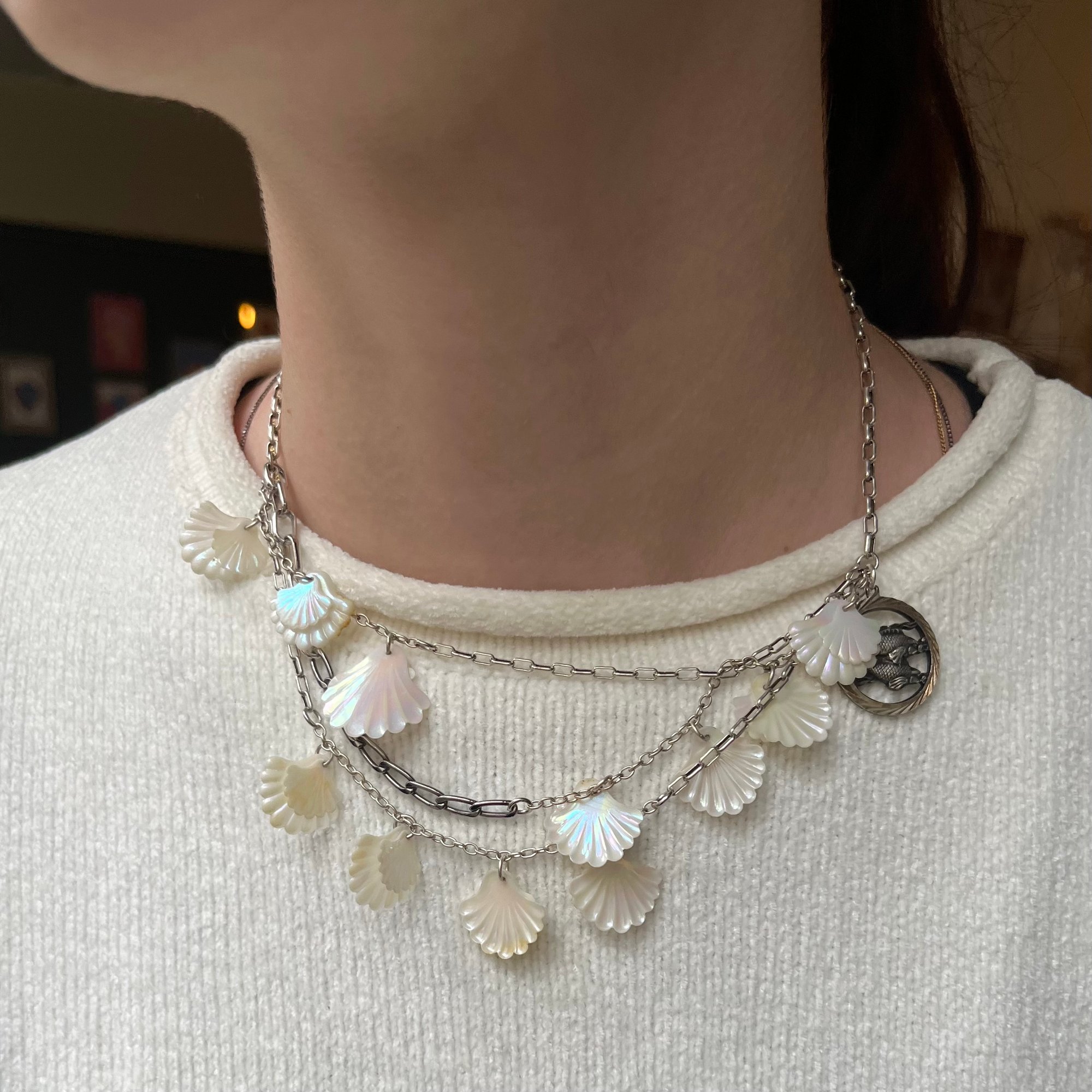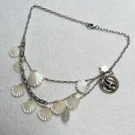 Il comprend dans sa composition une médaille vintage ajourée signe astro "Poissons" et des paillettes vintage petites coquilles en rodhoïd blanc nacré.