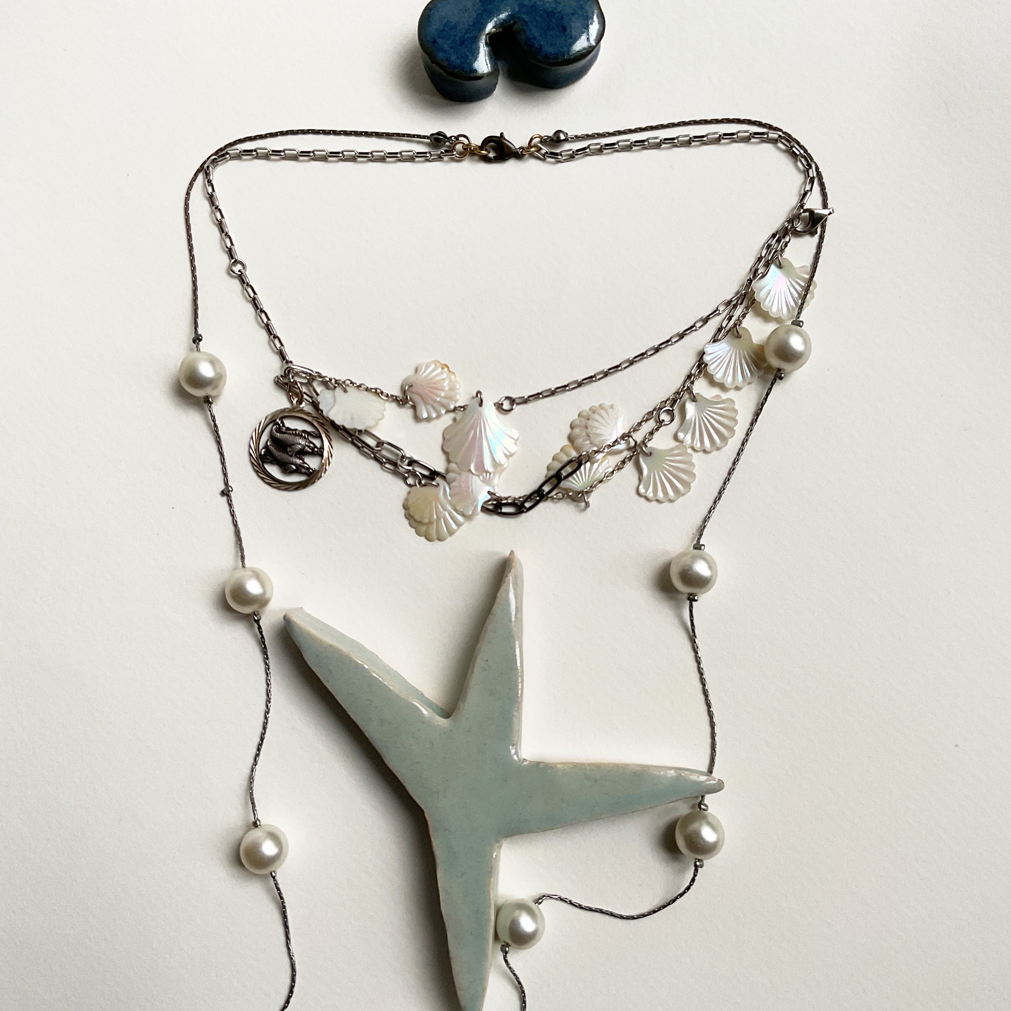 Le sautoir "POISSONS" est une pièce unique composée avec des matériaux upcyclés.
