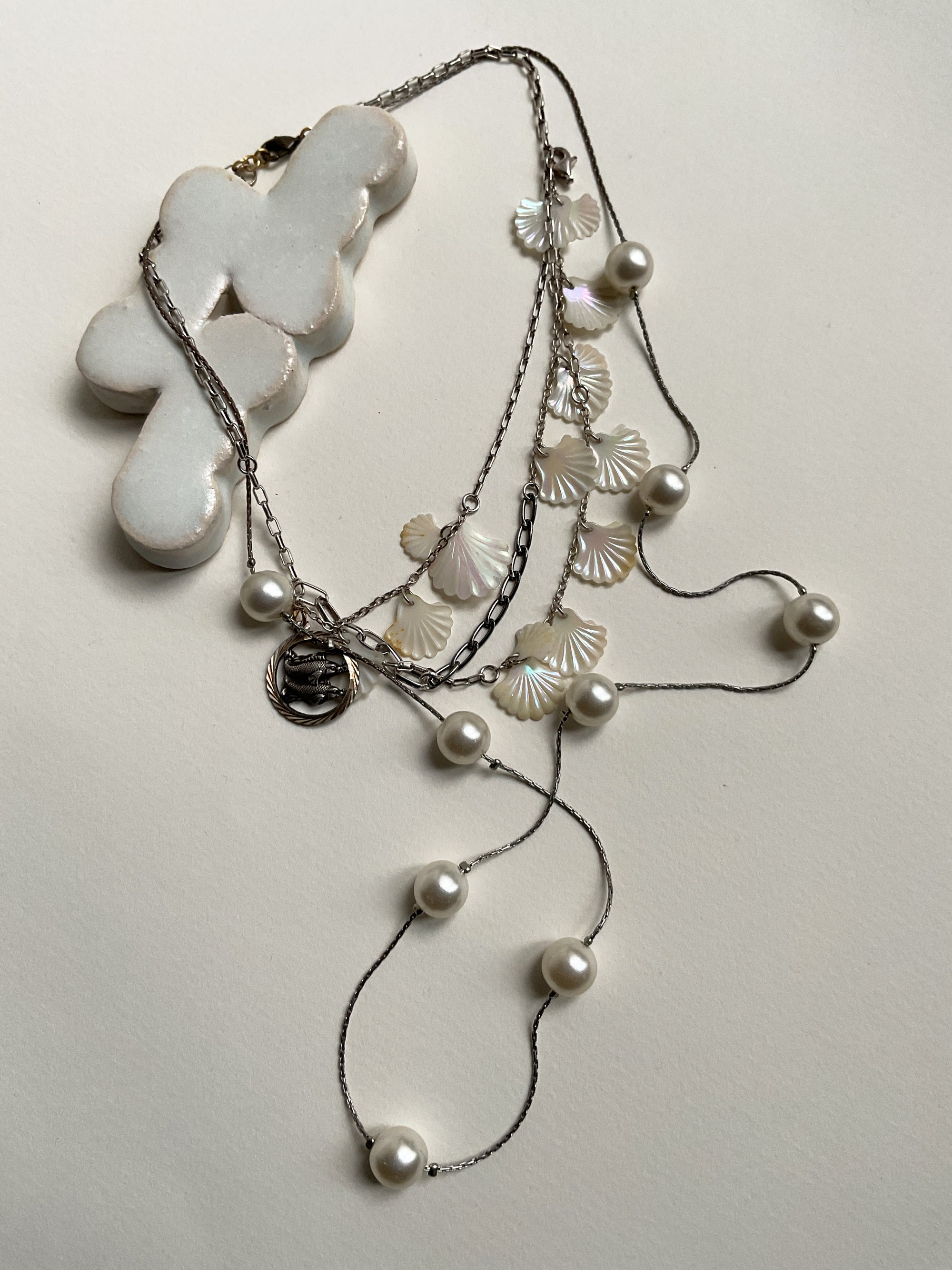 Sautoir perles nacrés incorporé au ras-du-cou pris en photo "porté"