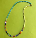 Le collier « POP numéro trois »est une pièce unique composée avec de toutes les petites perles mélangées dans les plateaux de composition de l’atelier.