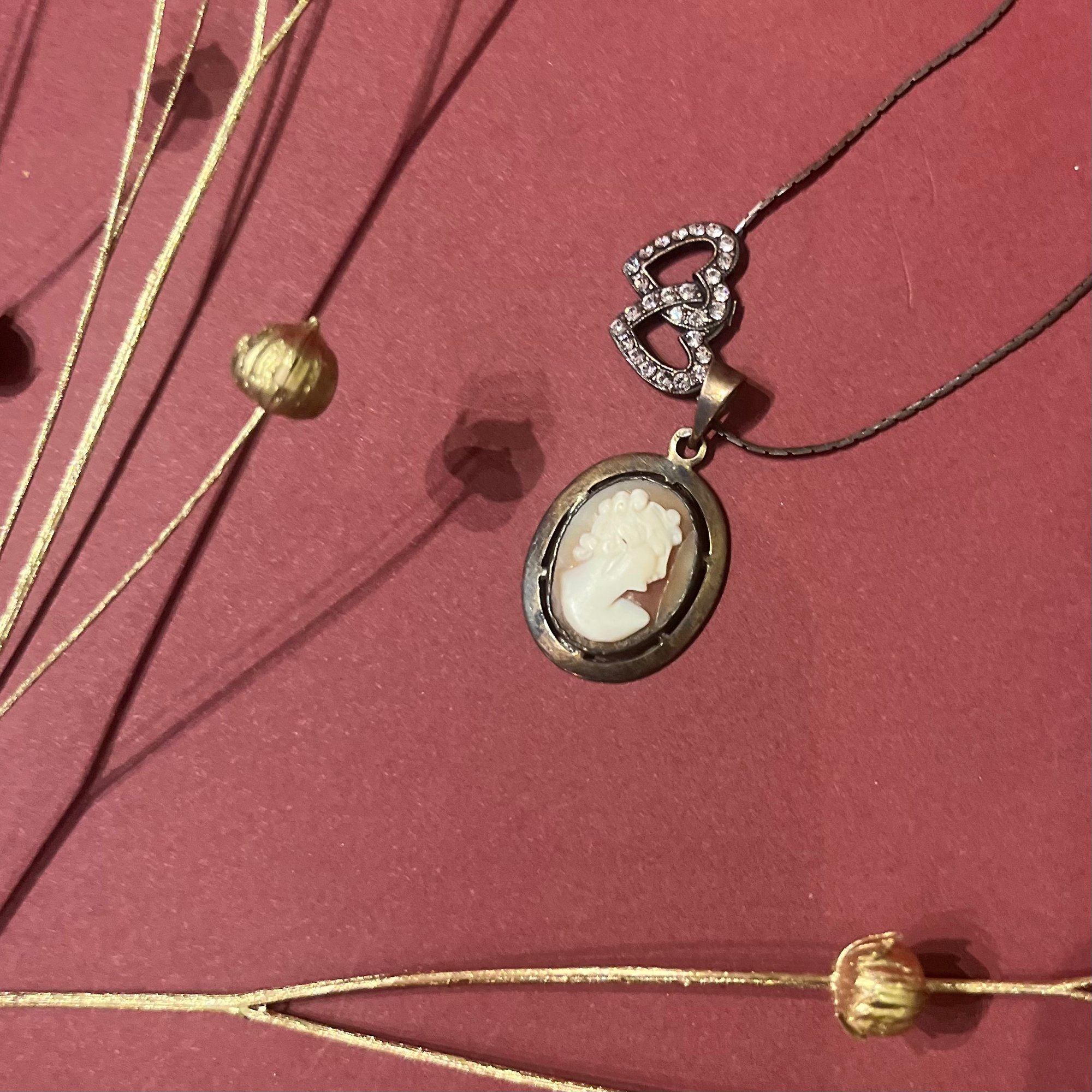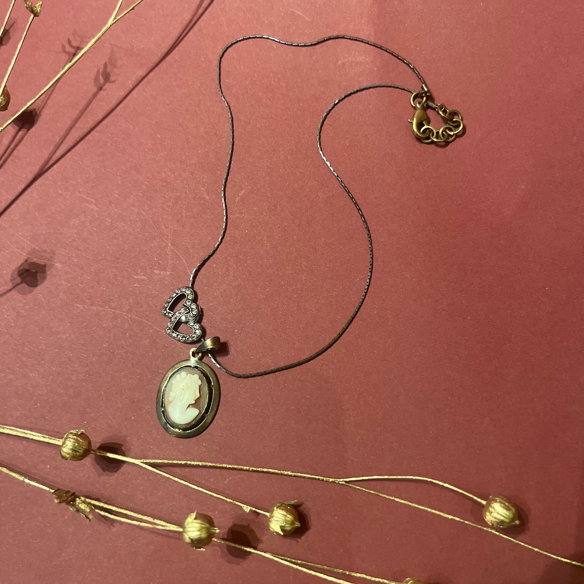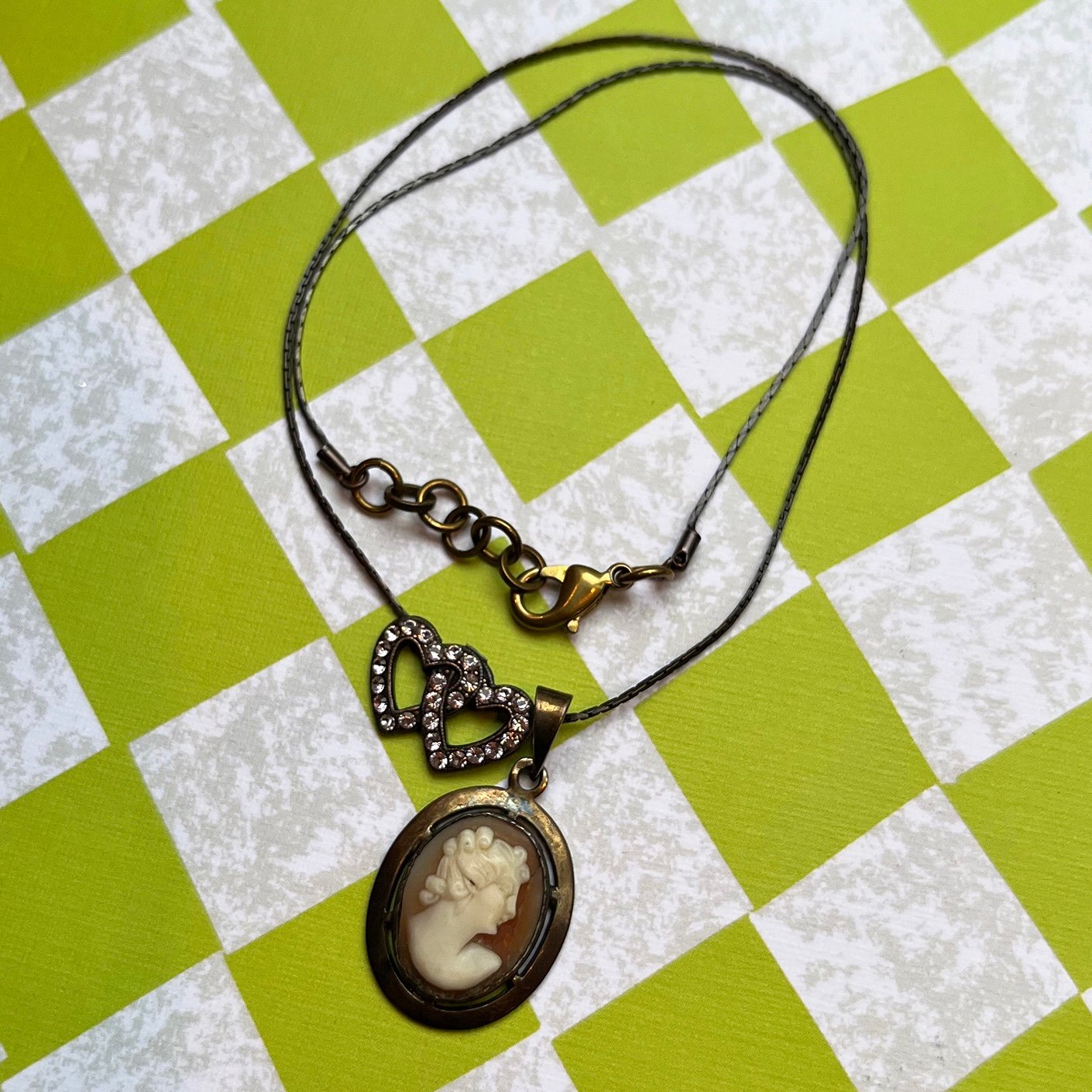 Le collier "TRAVIATA" est une pièce unique composée avec un camée ancien et une chaîne en laiton deux cœurs soudés.