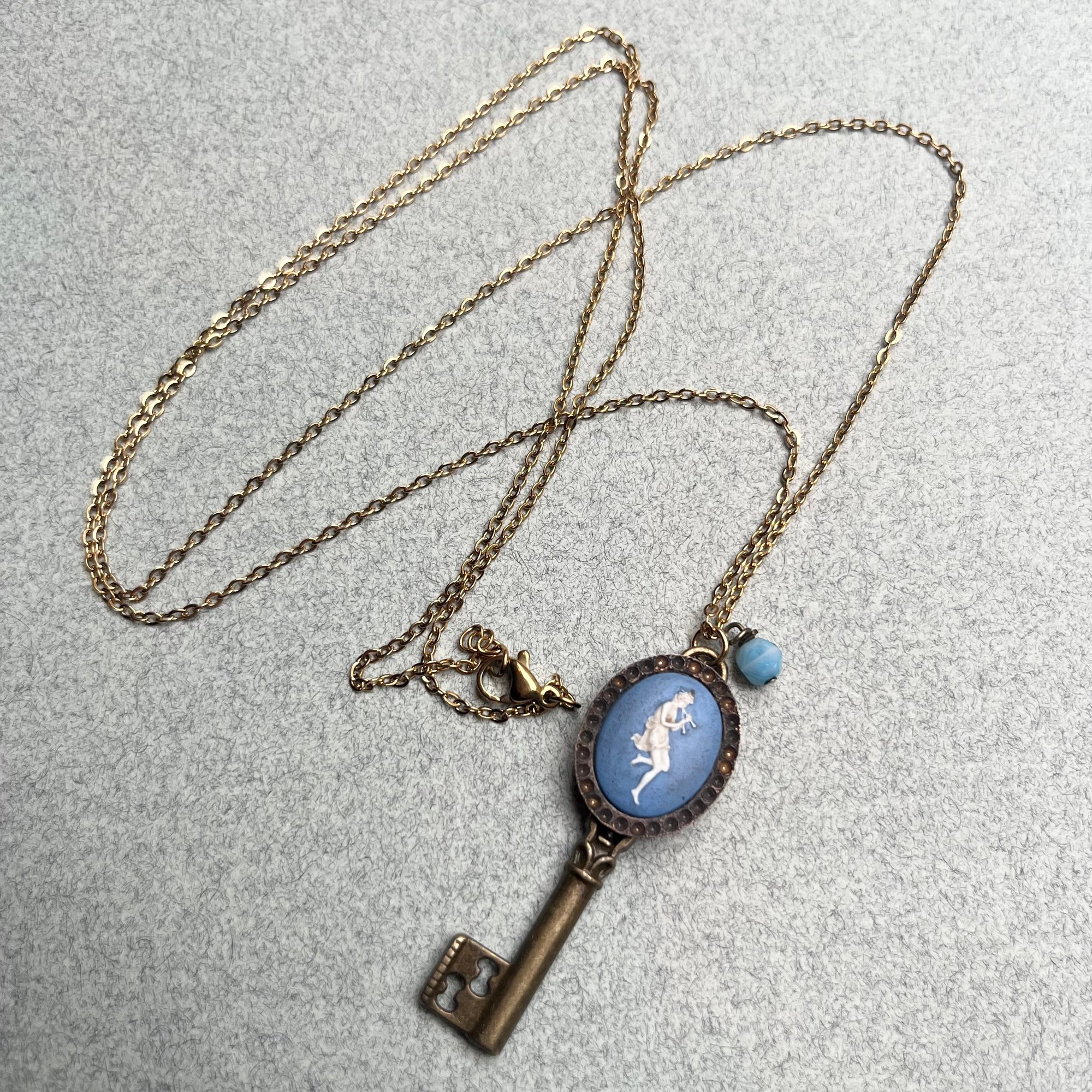 Le collier clef "WEGWOOD" est une pièce unique composée d'un camée bleu upcyclé. Chaîne en acier inoxydable doré.Collection pastel "OLYMPE DE GOUGES"