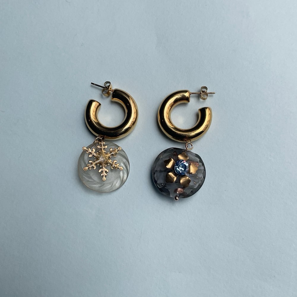 Ce bijou a été créé et assemblée à l’atelier-boutique parisien La Tonkinoise à Paris, il comprend dans sa composition : une perle vintage ovale en verre gris fumée pailleté ornée d’une estampe fleur en laiton brut et strass bleu ciel , un bouton ancien transparent et une estampe flocon de neige émaillée pailletée.