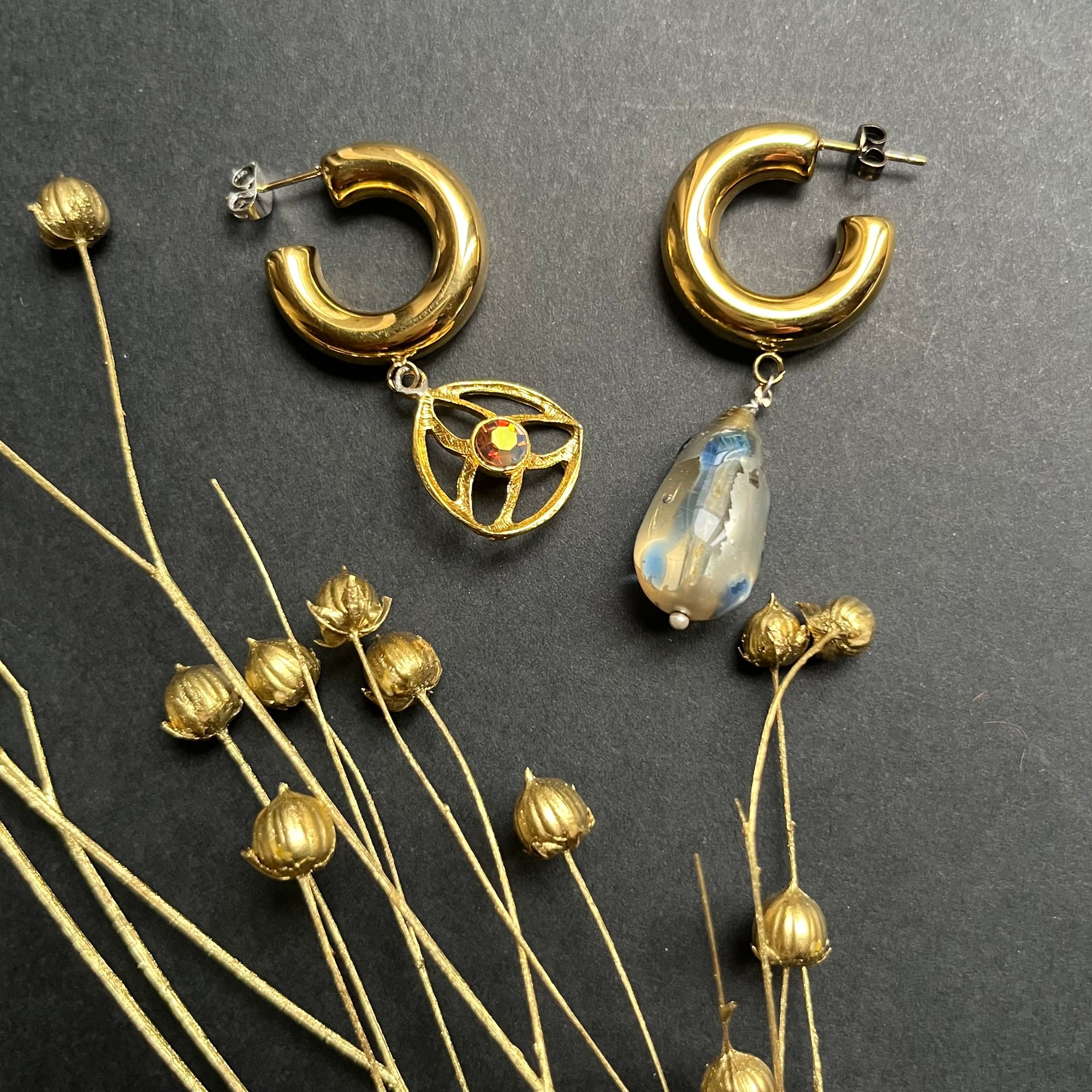 Les créoles asymétriques "TRIVELLA" sont une pièce unique composée avec des perles upcyclées.