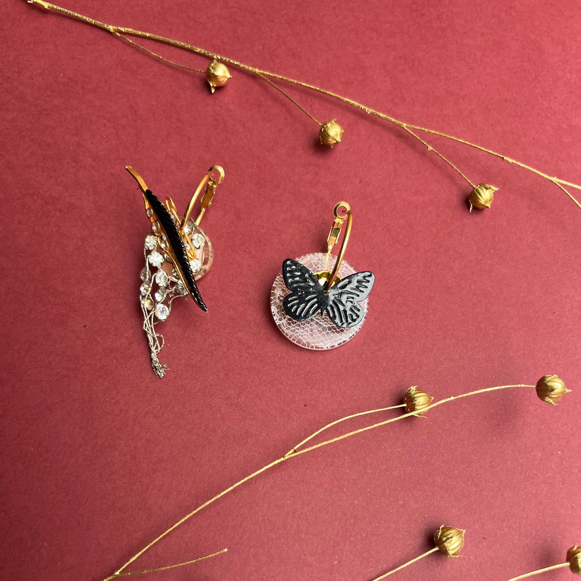 Les créoles asymétriques "VIOLETTA" sont une pièce unique composée de matériaux upcyclés. Elles comprends dans sa composition une broche plume émail noir vintage, un bouton récent inclusion dentelle blanche, créoles en acier inoxydable doré.Collection "MARIA CALLAS"