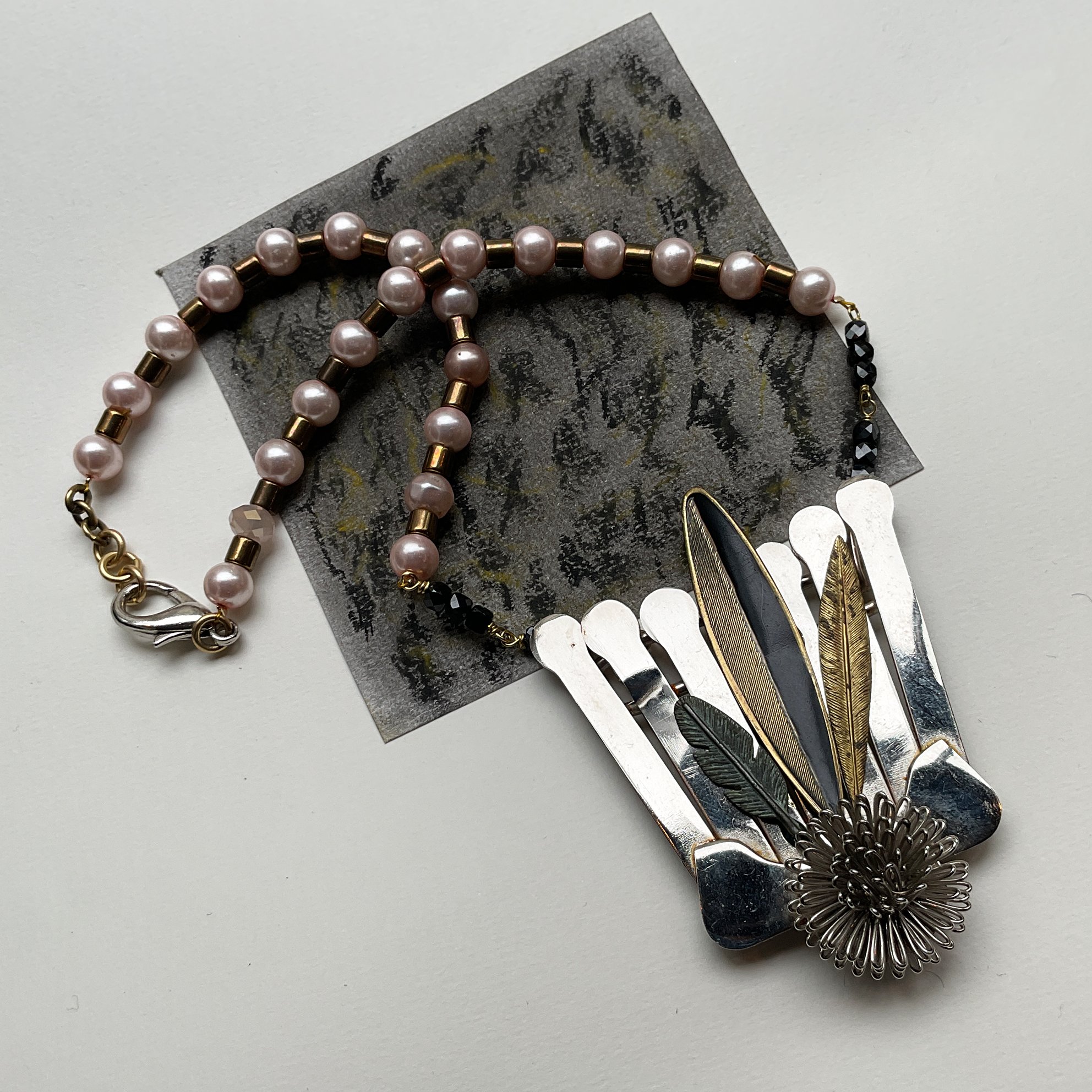 Le pendentif "KALFON" est une pièce unique composée de matériaux upcyclés.