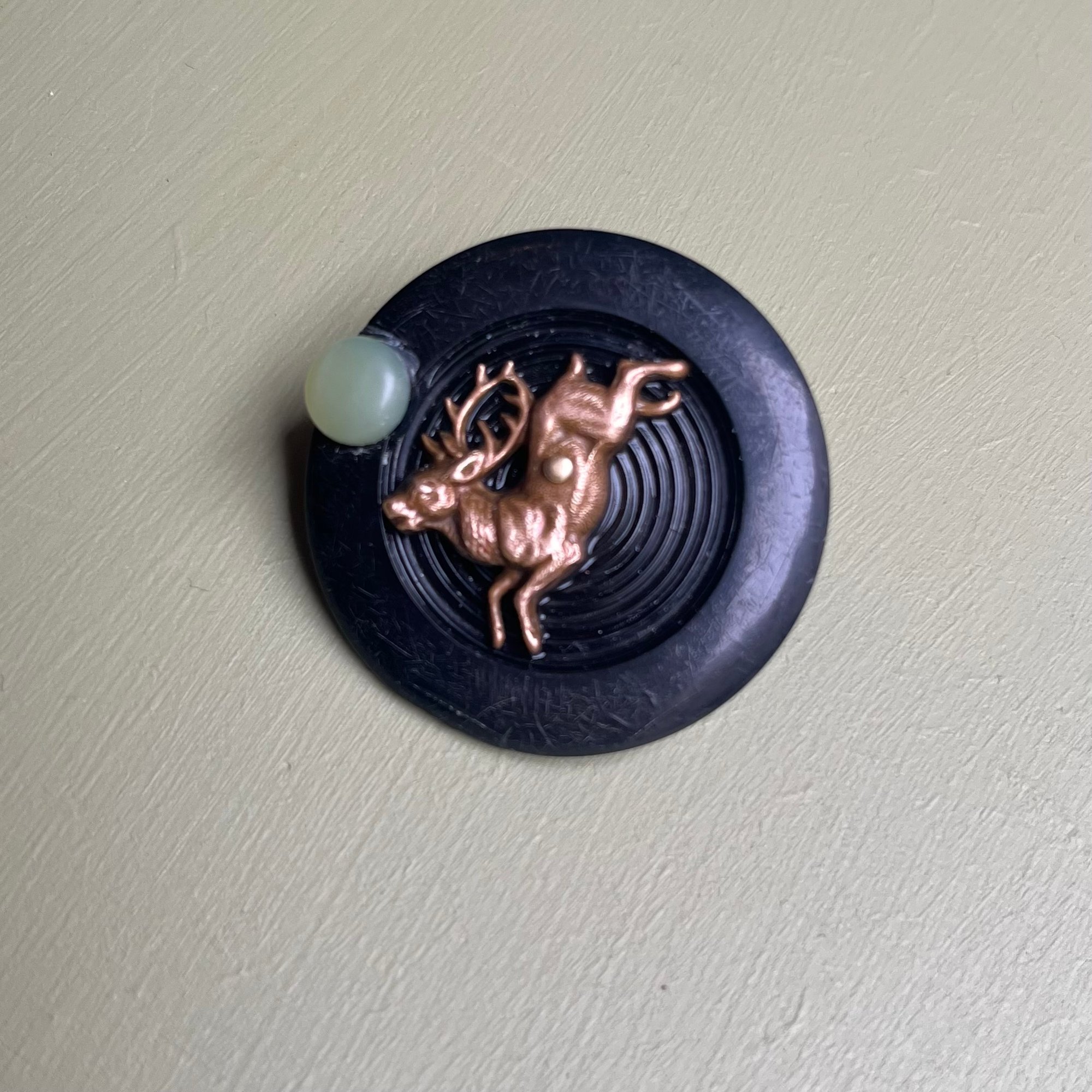 Le pins "CERF" est une pièce unique composée d'un bouton vintage en résine noire orné d'une estampe cerf.Mesure :Diametre bouton 3 cm Collection Automne "BEATRIX POTTER"