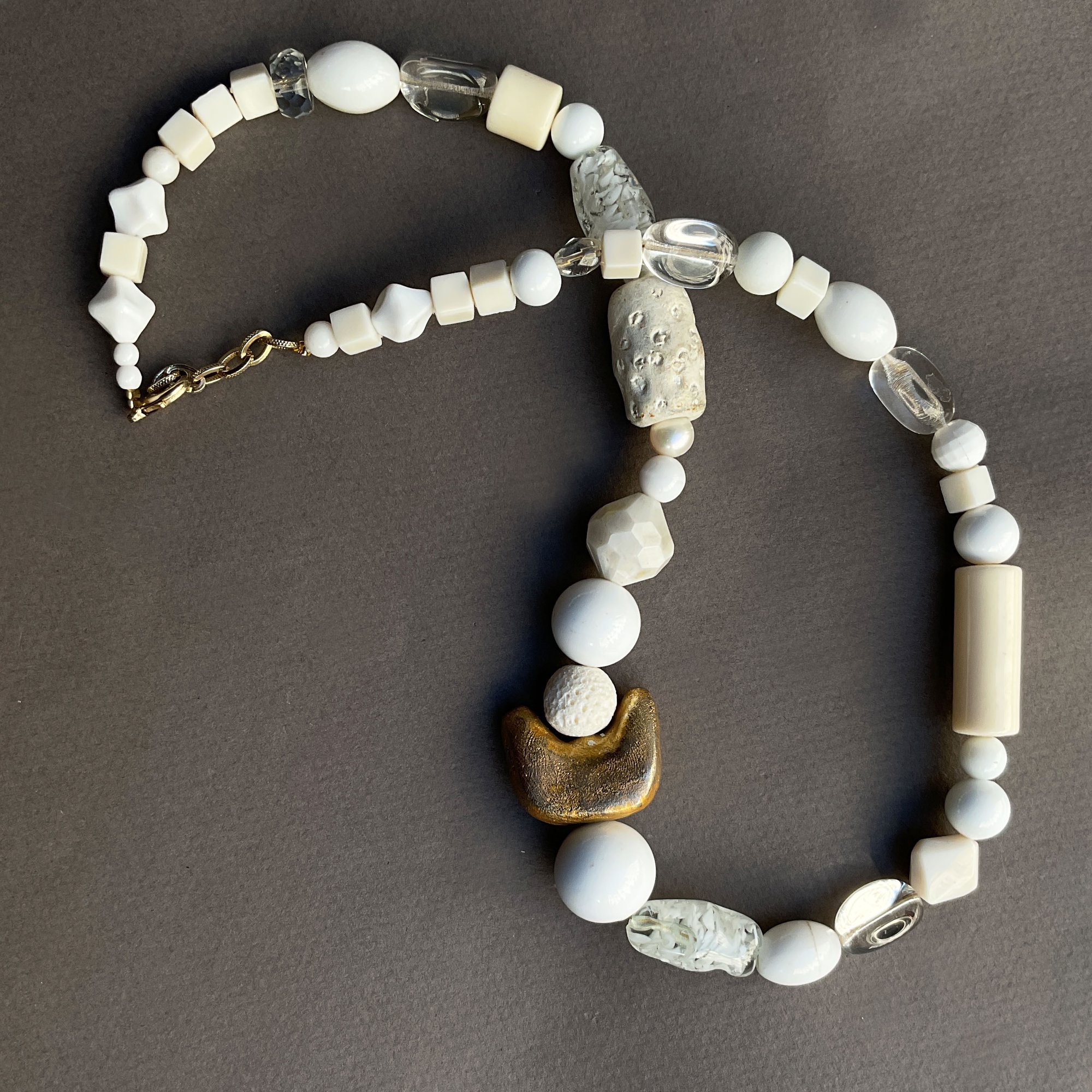 Le sautoir "ANGELA" est une pièce unique composée de perles vintage en céramique faites à la main, de perles blanches en résine et verre upcyclées.