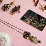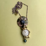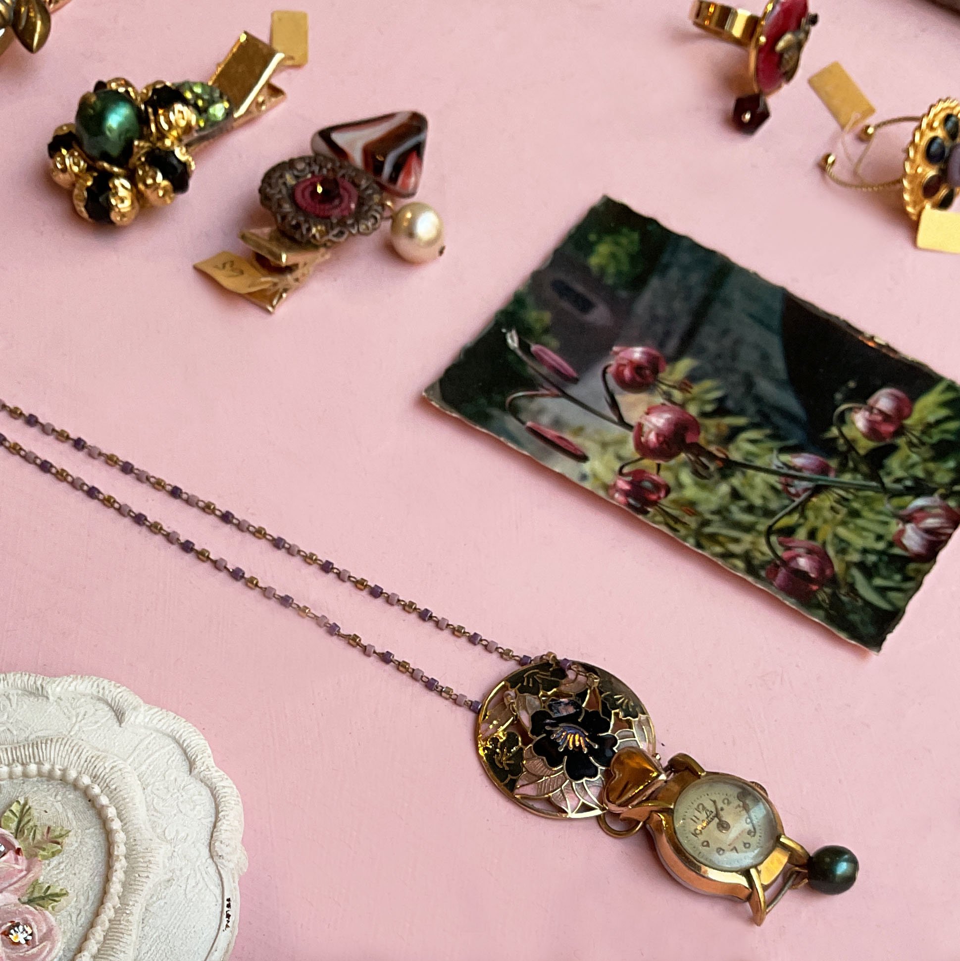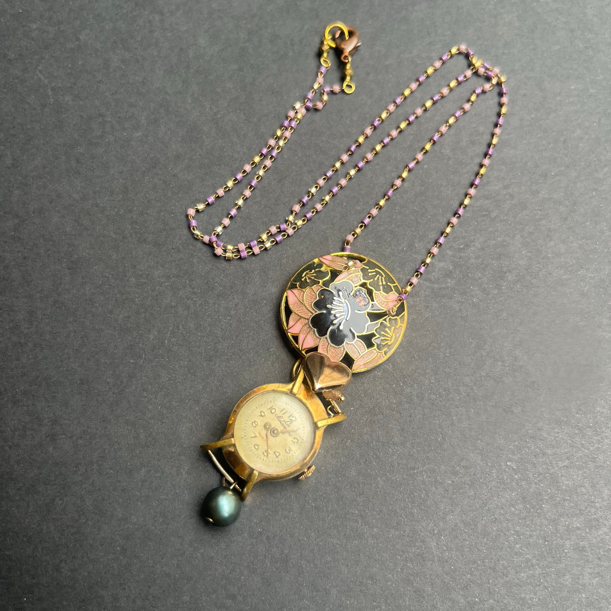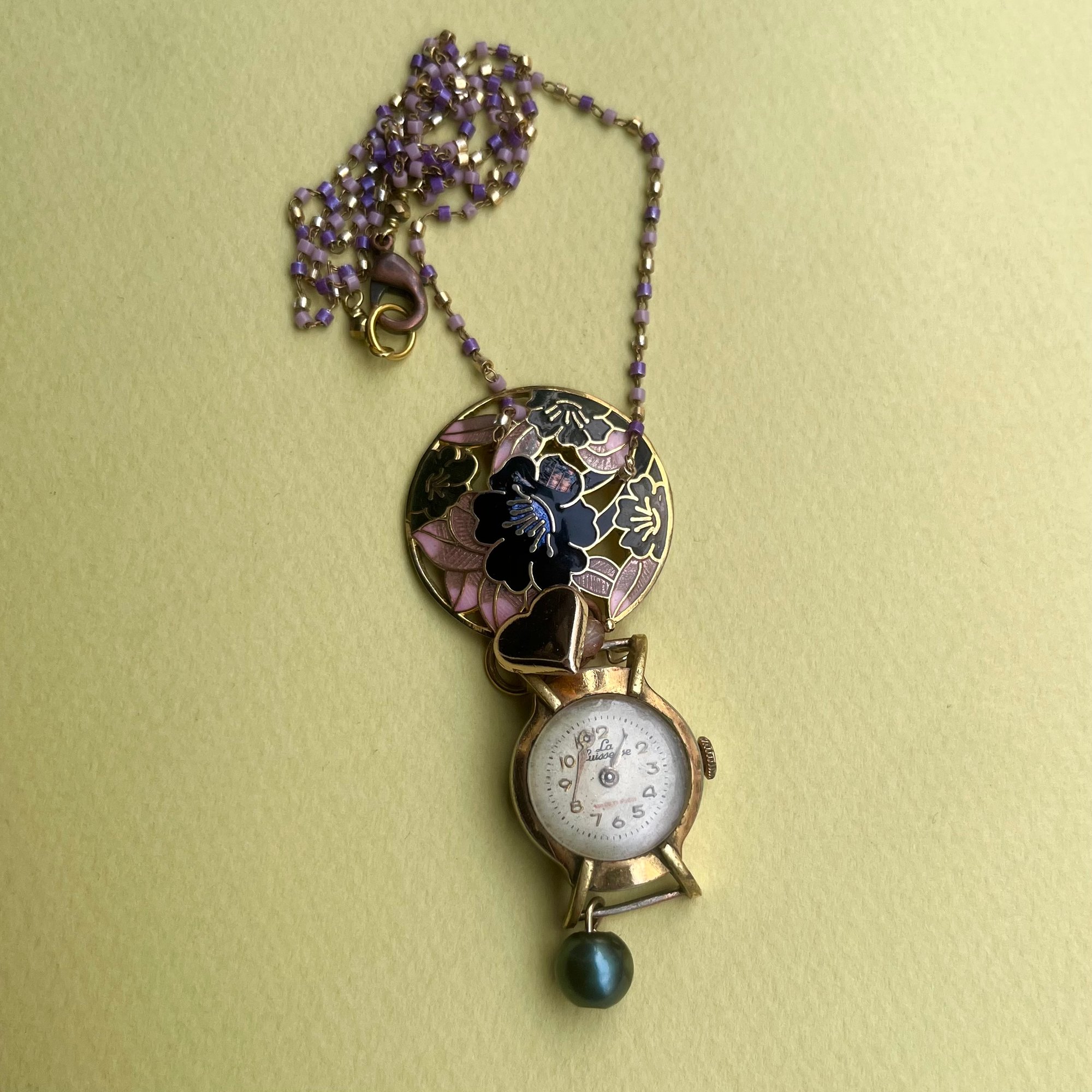Ce bijou comprends dans sa composition une petite montre ancienne customisée avec un médaillon fleuri émaillé multicolore.
