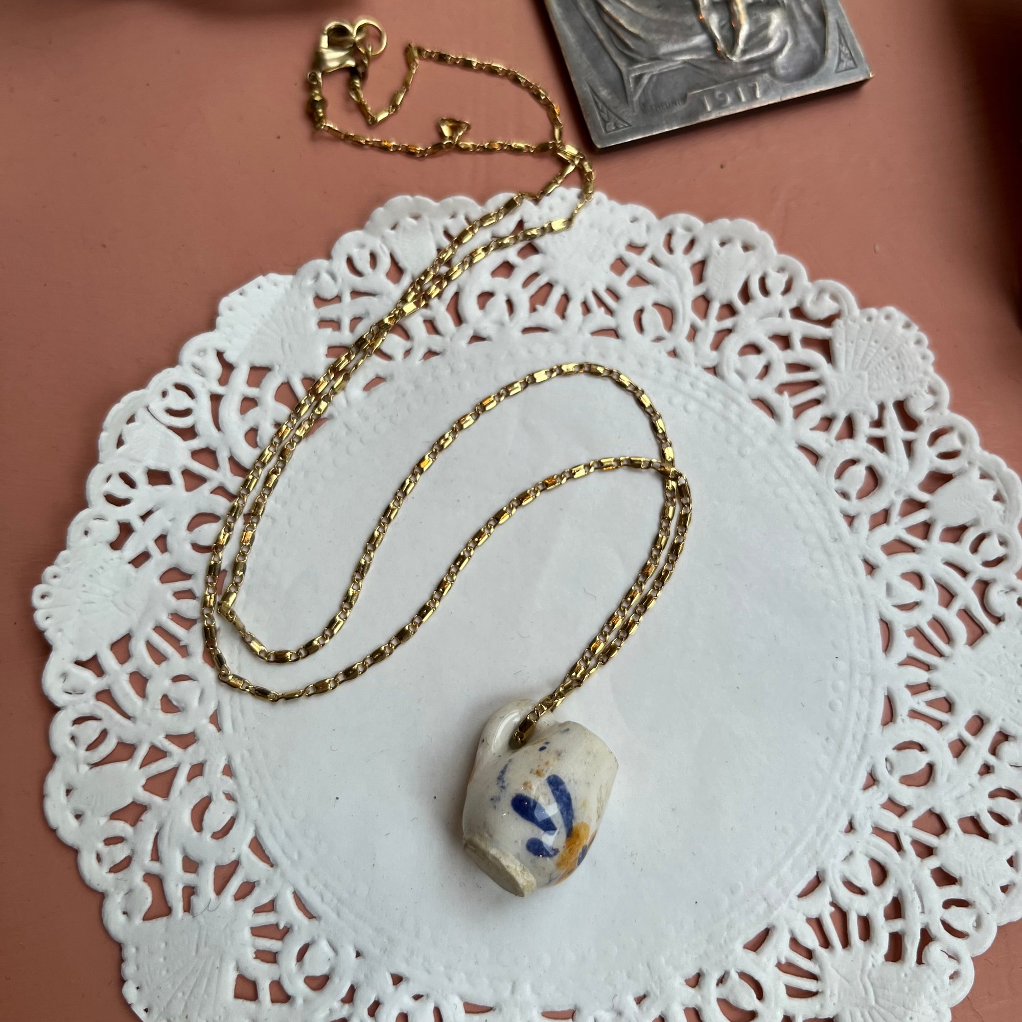 Le sautoir "FEDOR" est une pièce unique réalisée avec un pot à lait miniature en céramique.La chaîne rétro est récente en acier inoxydable doré.Collection "COMTESSE DE SÉGUR"