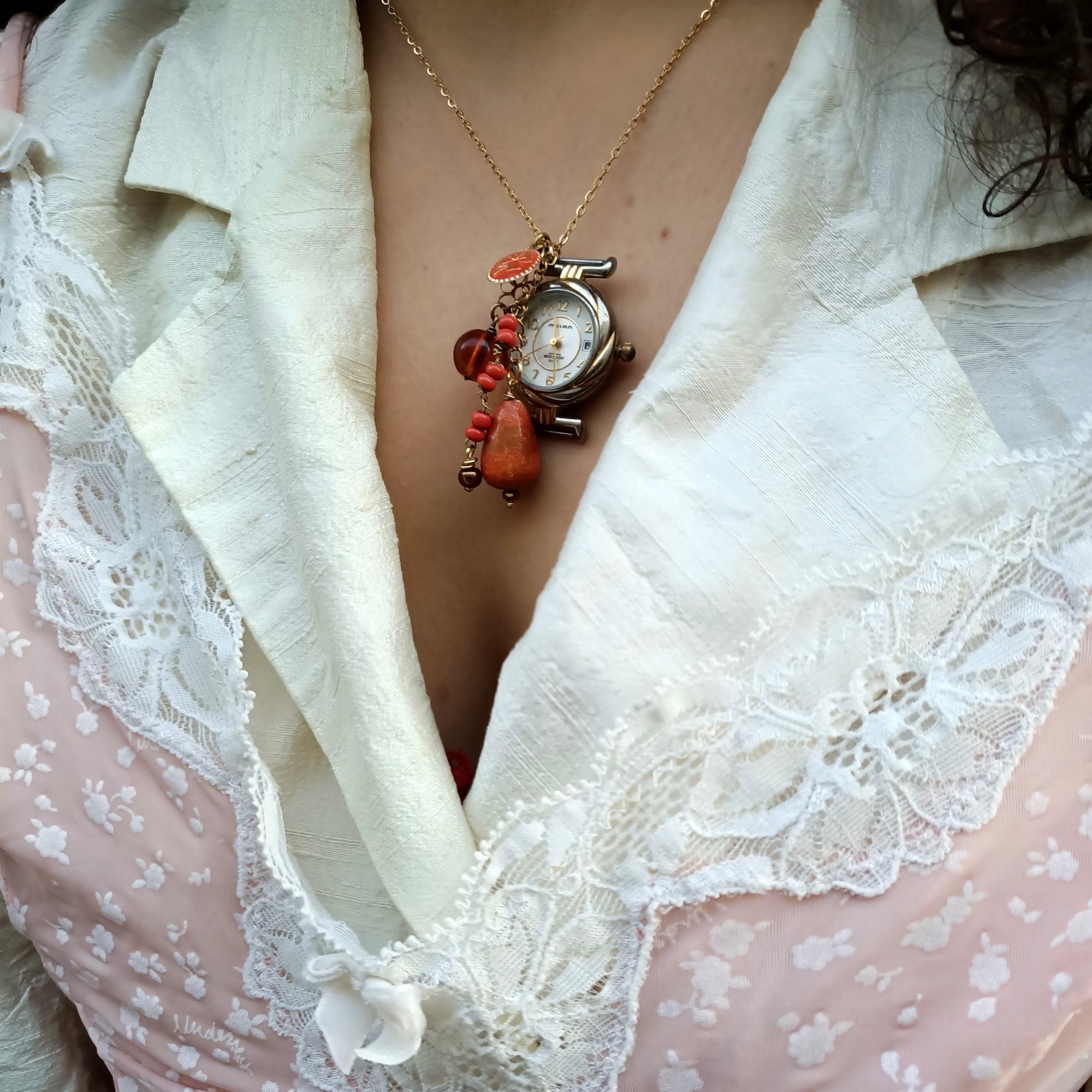 Ce bijou comprend dans sa composition une montre ornée de perles vintage en verre coloris potiron.